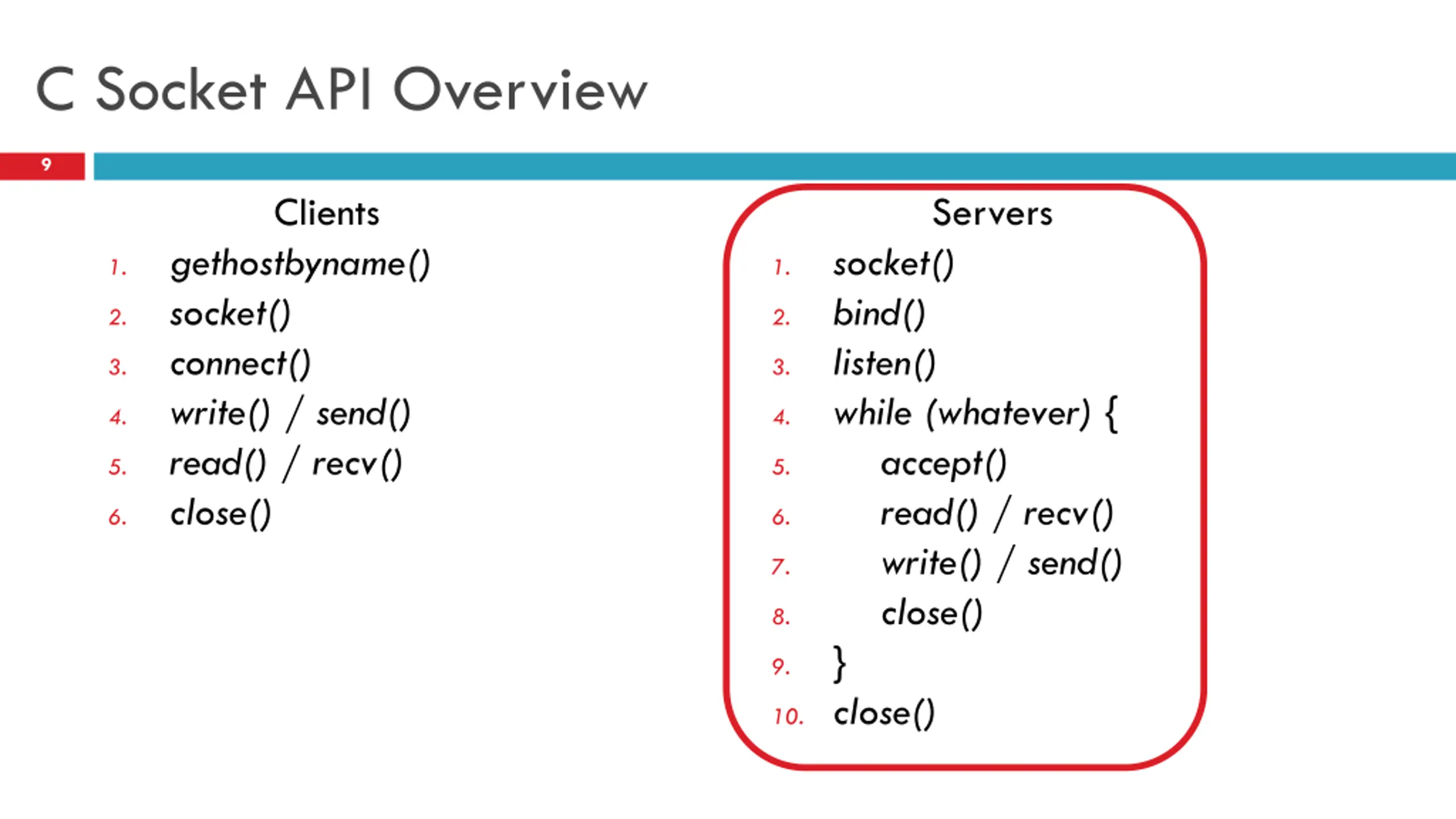 C Socket API Overview 9 Clients Servers gethostbyname() socket() connect() write() / send() read() / recv() close() socket() bind() listen() while (whatever) { accept() read() / recv() write() / send() close() } 10. close() 1. 1. 2. 2. 3. 3. 4. 4. 5. 5. 6. 6. 7. 8. 9.