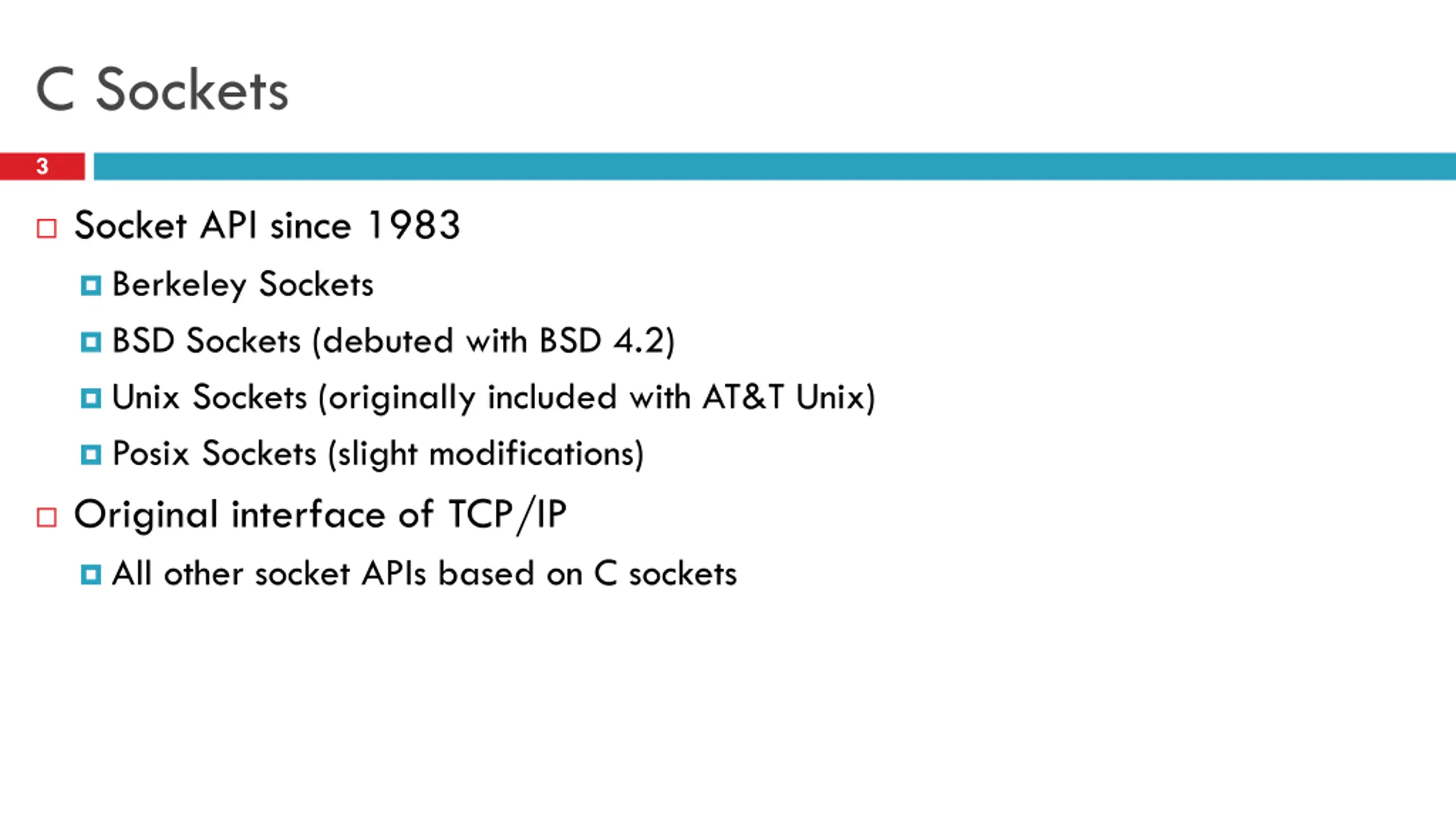 C Sockets 3 Socket API since 1983 Berkeley Sockets BSD Sockets (debuted with BSD 4.2) Unix Sockets (originally included with AT&T Unix) Posix Sockets (slight modifications) Original interface of TCP/IP All other socket APIs based on C sockets