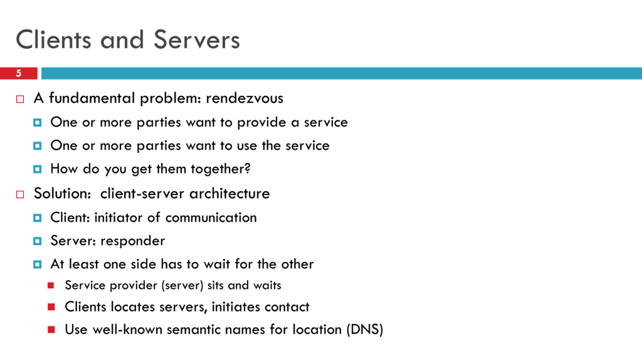 Clients and Servers 5 A fundamental problem: rendezvous One or more parties want to provide a service One or more parties want to use the service How do you get them together? Solution: client-server architecture Client: initiator of communication Server: responder At least one side has to wait for the other Service provider (server) sits and waits Clients locates servers, initiates contact Use well-known semantic names for location (DNS)
