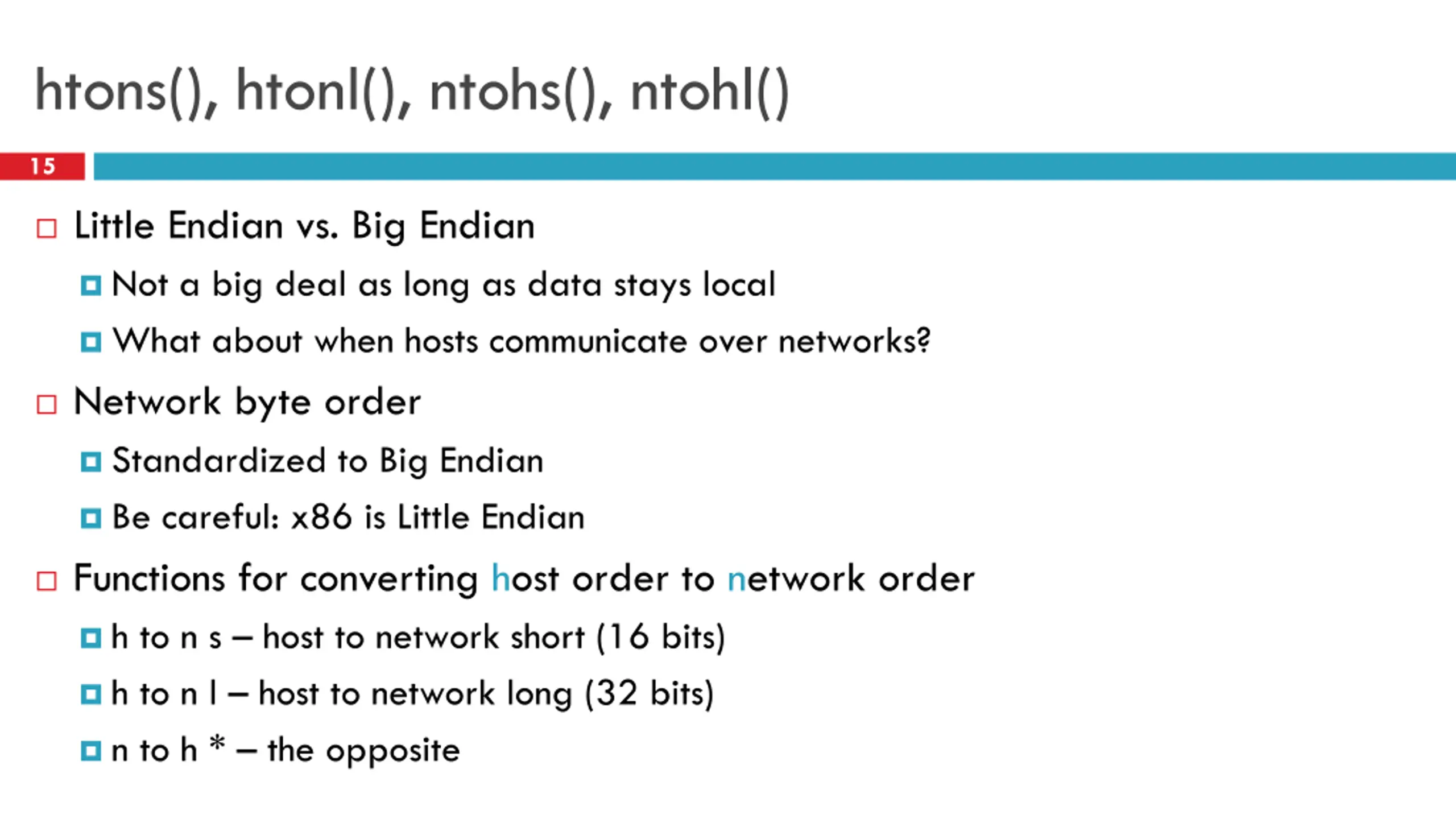 htons(), htonl(), ntohs(), ntohl() 15 Little Endian vs. Big Endian Not a big deal as long as data stays local What about when hosts communicate over networks? Network byte order Standardized to Big Endian Be careful: x86 is Little Endian Functions for converting host order to network order h to n s host to network short (16 bits) h to n l host to network long (32 bits) n to h * the opposite