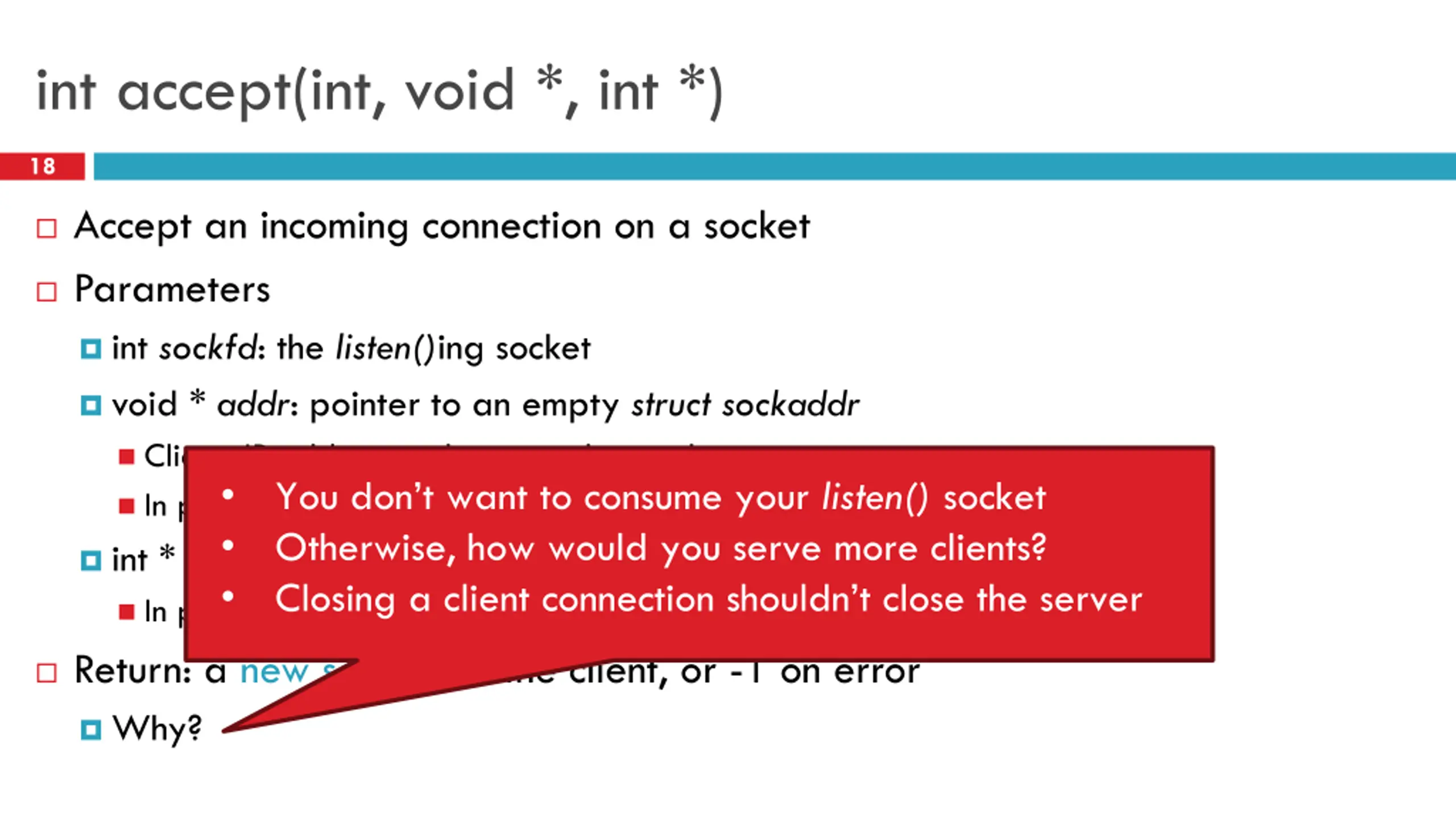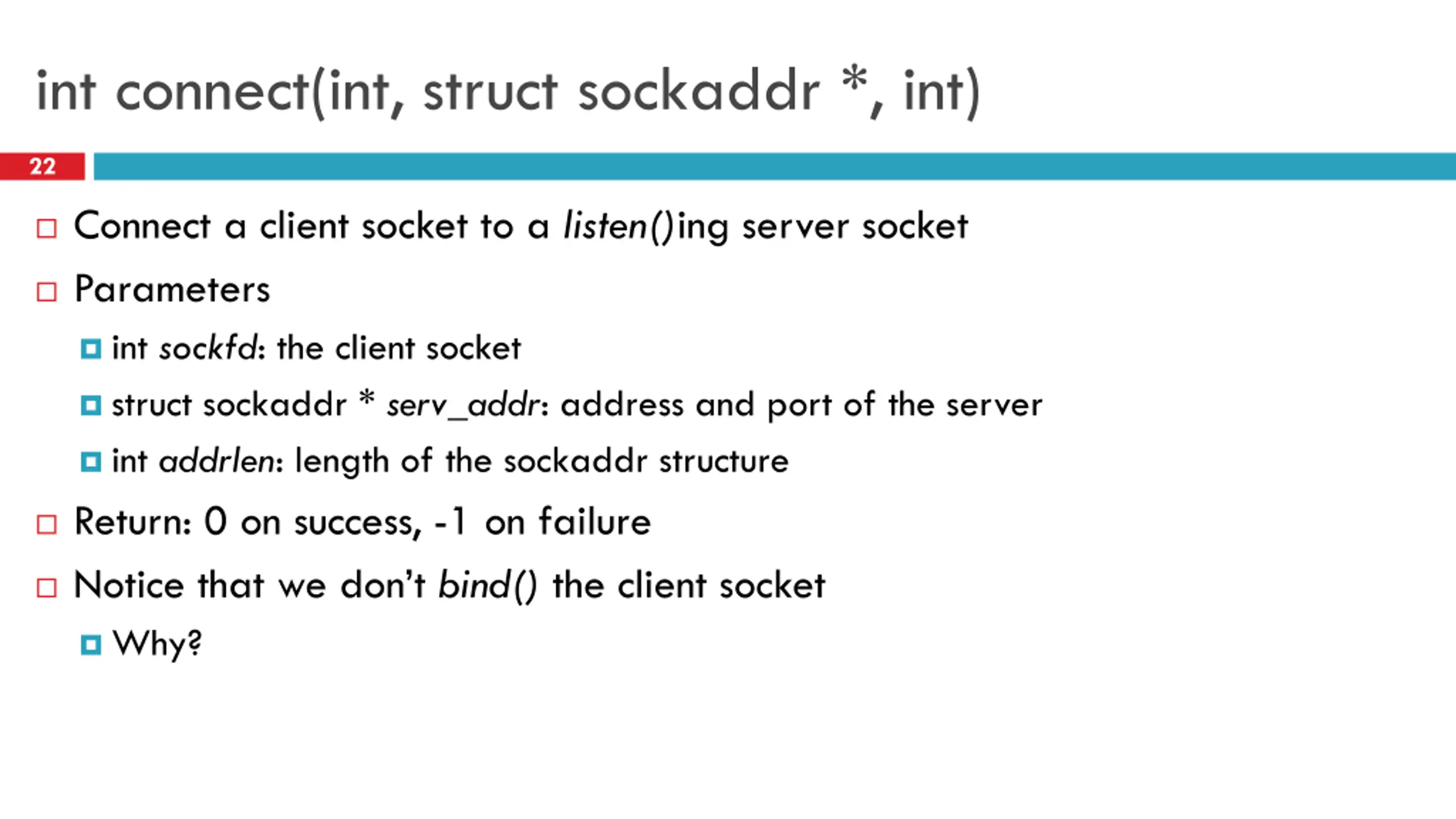 int connect(int, struct sockaddr *, int) 22 Connect a client socket to a listen()ing server socket Parameters int sockfd: the client socket struct sockaddr * serv_addr: address and port of the server int addrlen: length of the sockaddr structure Return: 0 on success, -1 on failure Notice that we don t bind() the client socket Why?