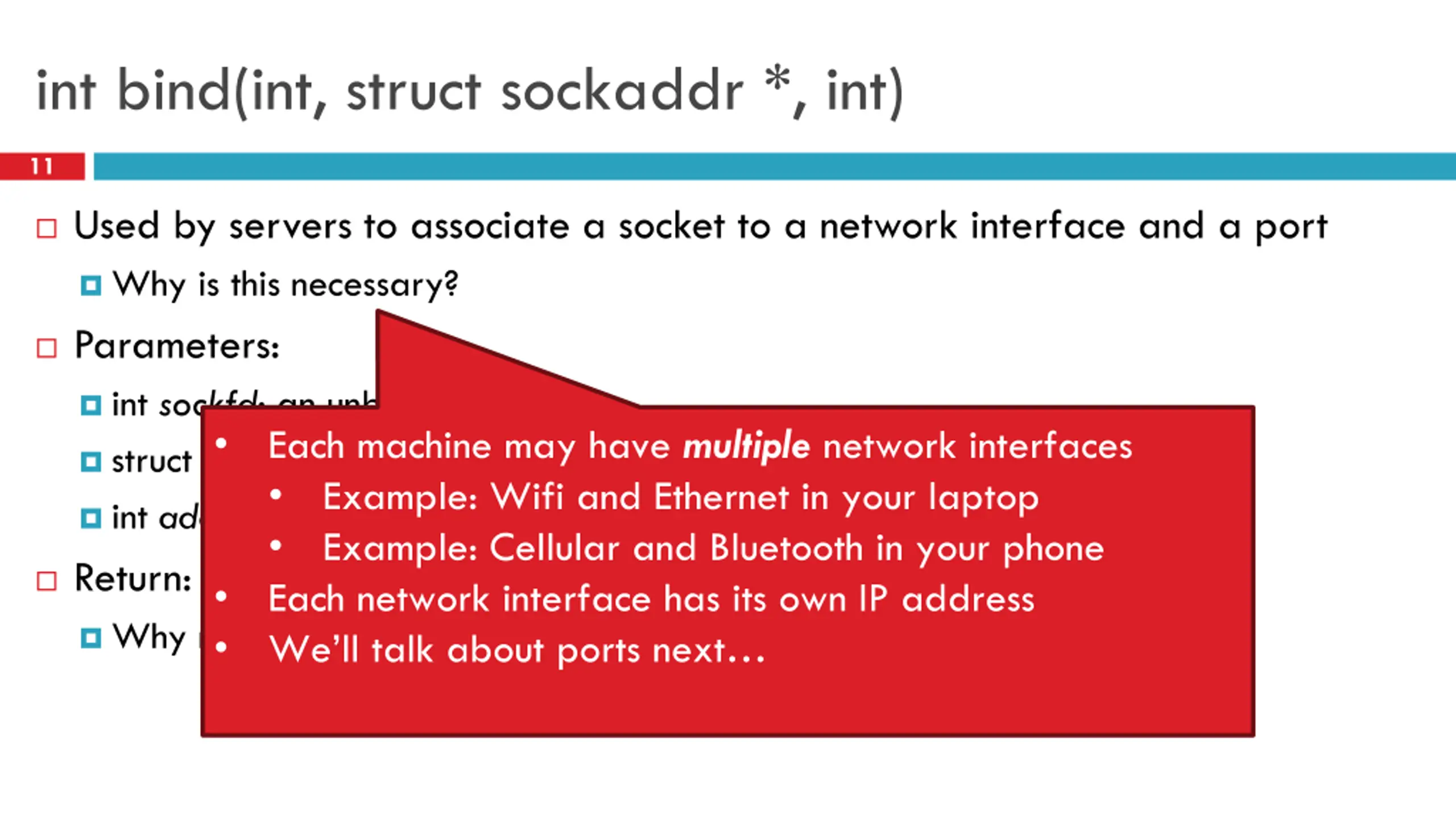 int bind(int, struct sockaddr *, int) 11 Used by servers to associate a socket to a network interface and a port Why is this necessary? Parameters: int sockfd: an unbound socket struct sockaddr * my_addr: the desired IP address and port int addrlen: sizeof(struct sockaddr) Example: Cellular and Bluetooth in your phone Each network interface has its own IP address We ll talk about ports next Each machine may have multiple network interfaces Example: Wifi and Ethernet in your laptop Return: 0 on success, -1 on failure Why might bind() fail?