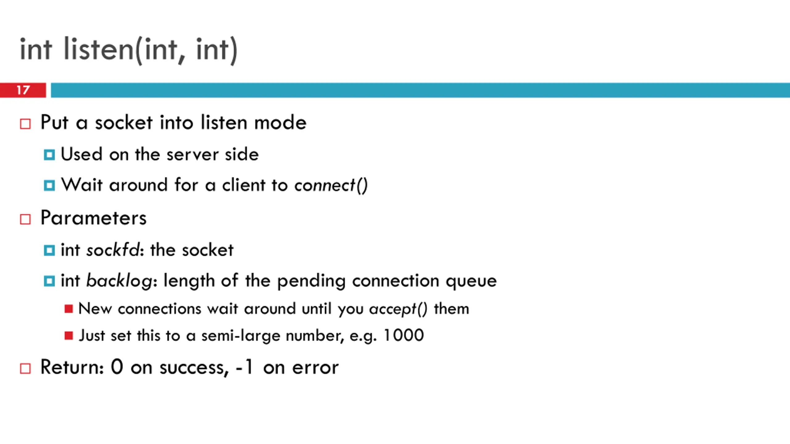 int listen(int, int) 17 Put a socket into listen mode Used on the server side Wait around for a client to connect() Parameters int sockfd: the socket int backlog: length of the pending connection queue New connections wait around until you accept() them Just set this to a semi-large number, e.g. 1000 Return: 0 on success, -1 on error