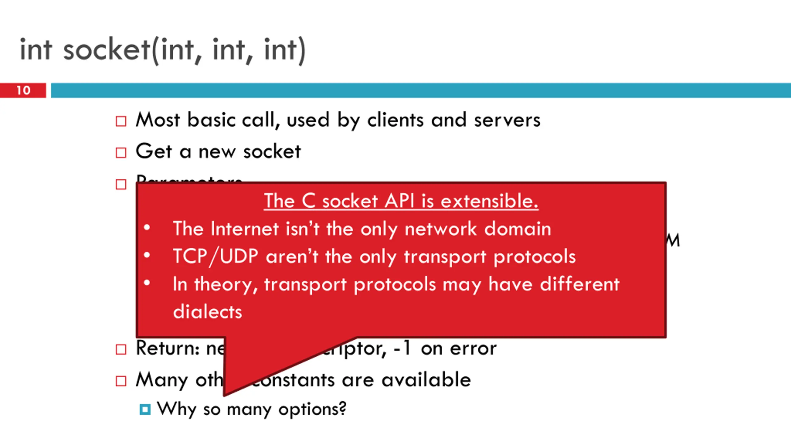 int socket(int, int, int) 10 Most basic call, used by clients and servers Get a new socket Parameters int domain: a constant, usually PF_INET int type: a constant, usually SOCK_STREAM or SOCK_DGRAM SOCK_STREAM means TCP SOCK_DGRAM means UDP int protocol: usually 0 (zero) Return: new file descriptor, -1 on error Many other constants are available Why so many options? The C socket API is extensible. The Internet isn t the only network domain TCP/UDP aren t the only transport protocols In theory, transport protocols may have different dialects