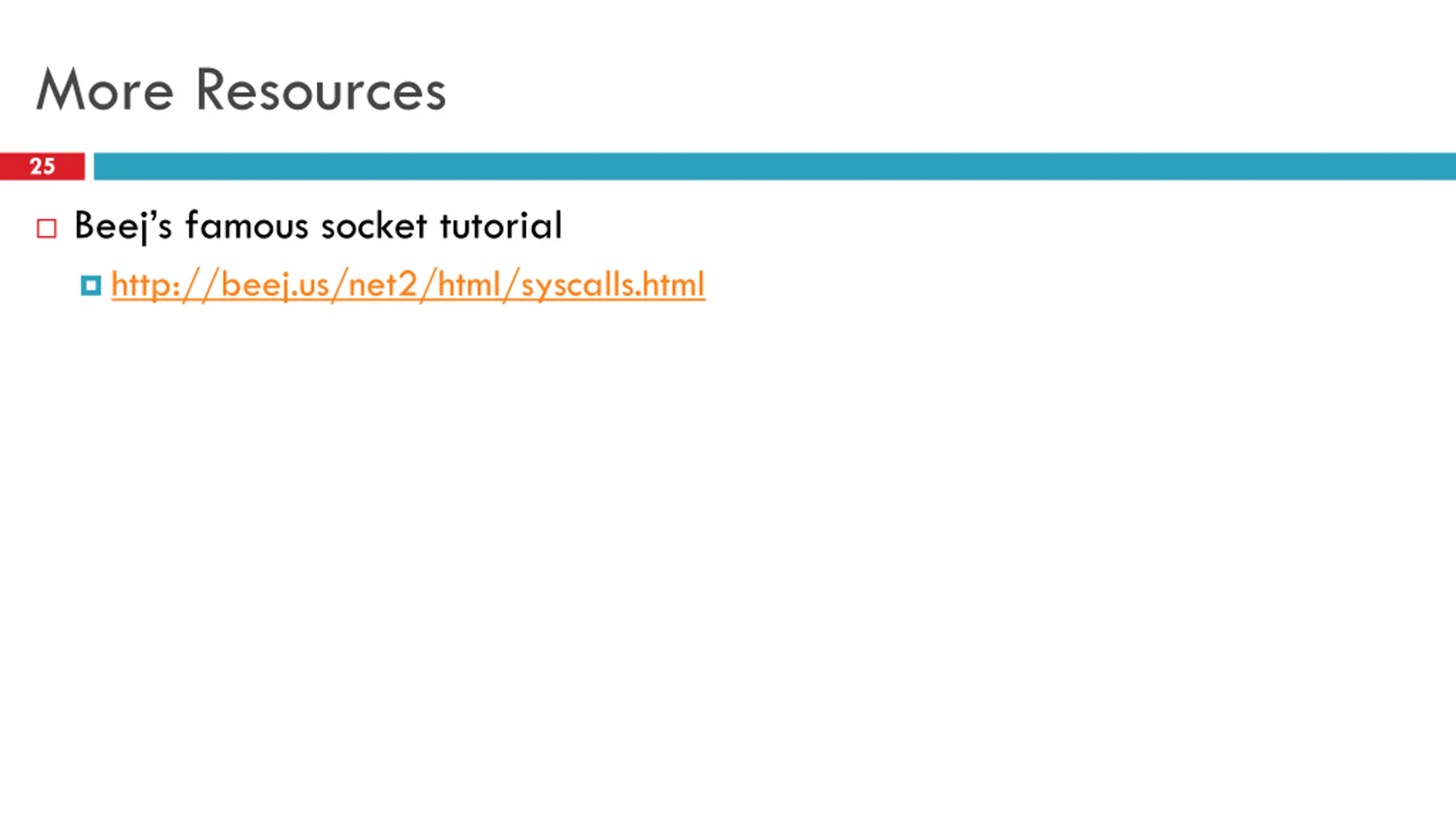 More Resources 25 Beej s famous socket tutorial http://beej.us/net2/html/syscalls.html