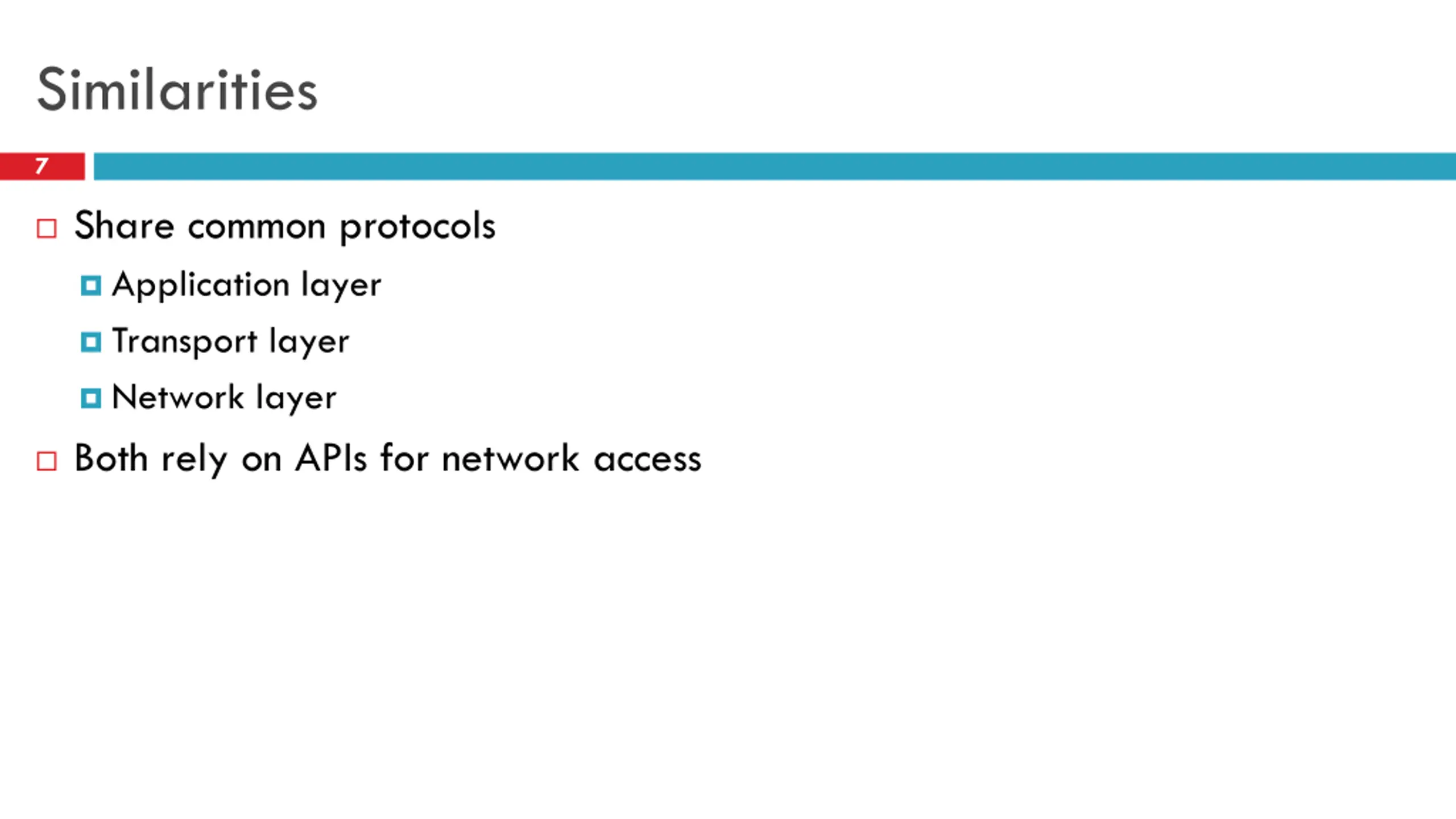 Similarities 7 Share common protocols Application layer Transport layer Network layer Both rely on APIs for network access