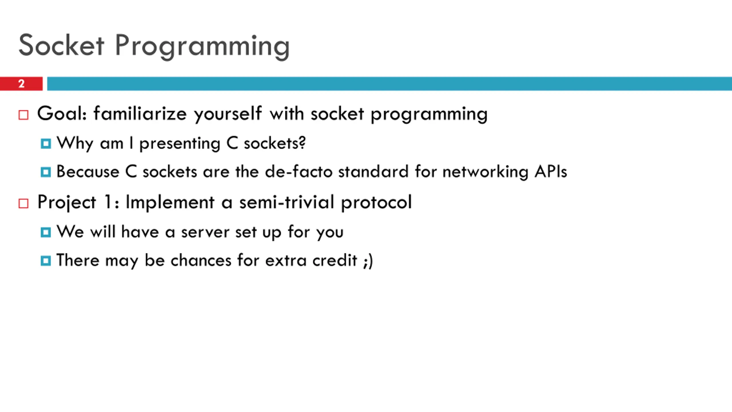 Socket Programming 2 Goal: familiarize yourself with socket programming Why am I presenting C sockets? Because C sockets are the de-facto standard for networking APIs Project 1: Implement a semi-trivial protocol We will have a server set up for you There may be chances for extra credit ;)