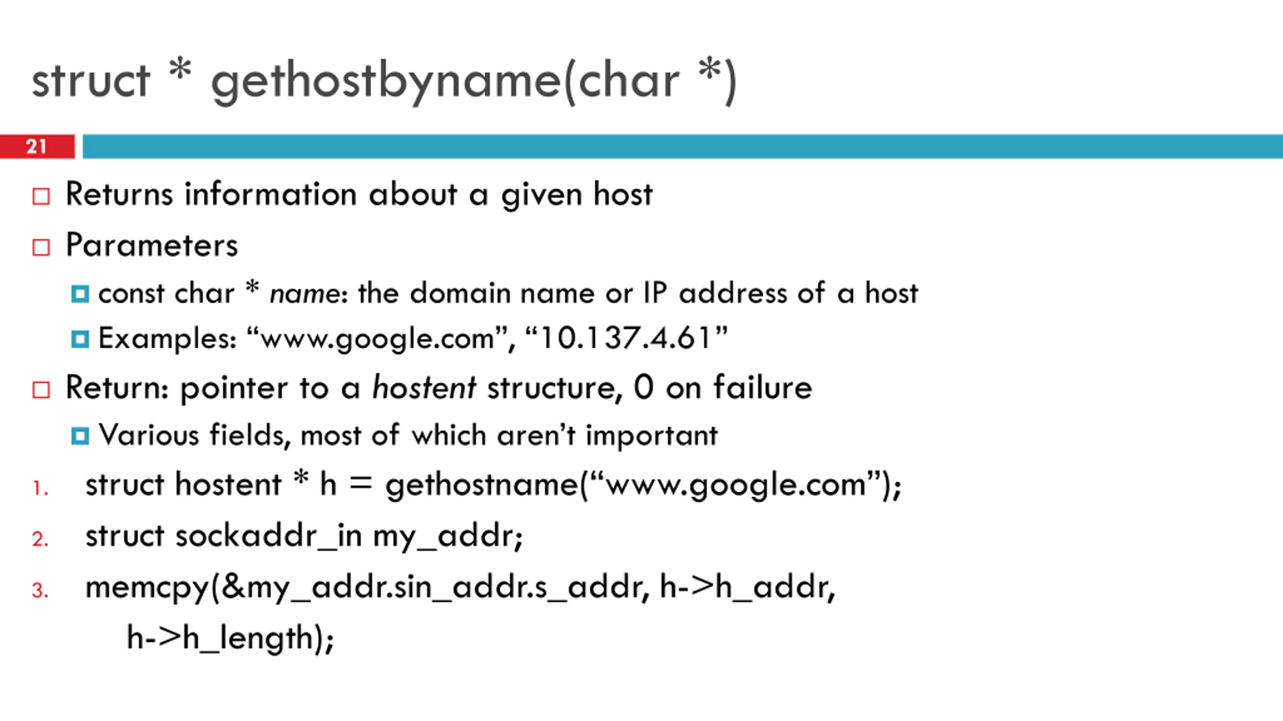 struct * gethostbyname(char *) 21 Returns information about a given host Parameters const char * name: the domain name or IP address of a host Examples: www.google.com , 10.137.4.61 Return: pointer to a hostent structure, 0 on failure Various fields, most of which aren t important struct hostent * h = gethostname( www.google.com ); struct sockaddr_in my_addr; memcpy(&my_addr.sin_addr.s_addr, h->h_addr, h->h_length); 1. 2. 3.