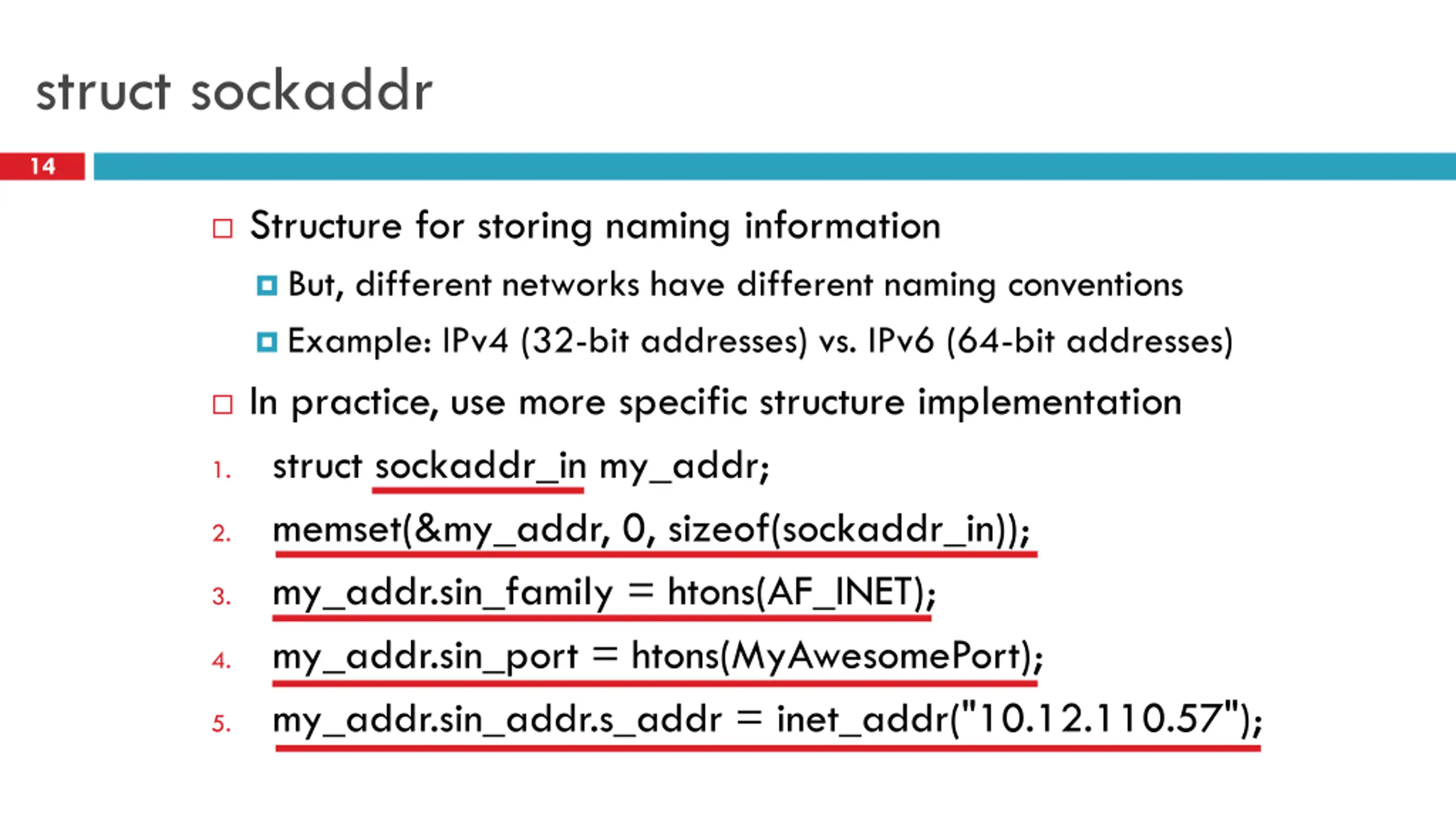 struct sockaddr 14 Structure for storing naming information But, different networks have different naming conventions Example: IPv4 (32-bit addresses) vs. IPv6 (64-bit addresses) In practice, use more specific structure implementation struct sockaddr_in my_addr; memset(&my_addr, 0, sizeof(sockaddr_in)); my_addr.sin_family = htons(AF_INET); my_addr.sin_port = htons(MyAwesomePort); my_addr.sin_addr.s_addr = inet_addr("10.12.110.57"); 1. 2. 3. 4. 5.