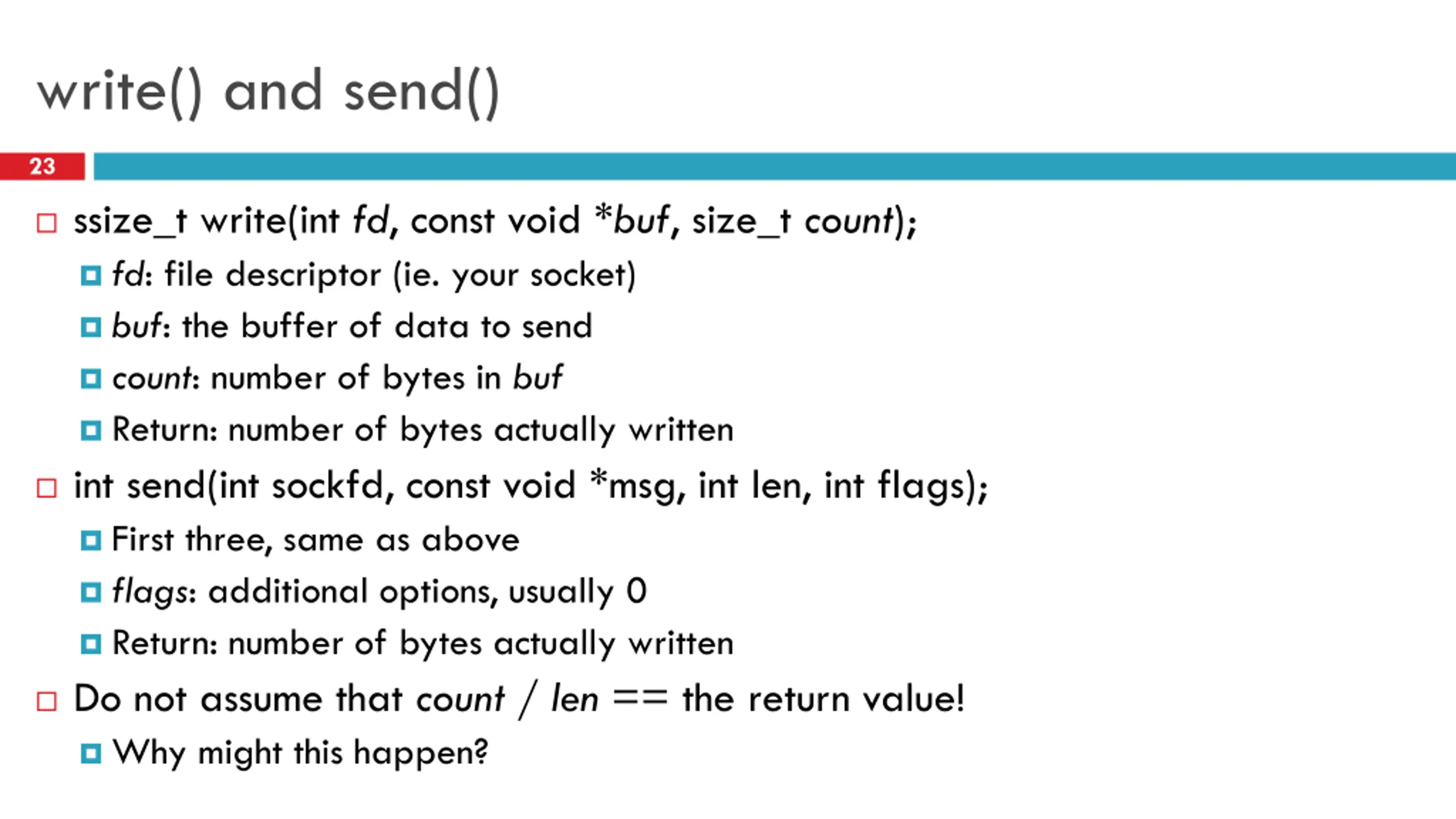 write() and send() 23 ssize_t write(int fd, const void *buf, size_t count); fd: file descriptor (ie. your socket) buf: the buffer of data to send count: number of bytes in buf Return: number of bytes actually written int send(int sockfd, const void *msg, int len, int flags); First three, same as above flags: additional options, usually 0 Return: number of bytes actually written Do not assume that count / len == the return value! Why might this happen?