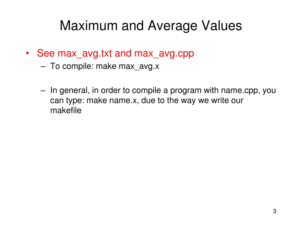 Maximum and Average Values See max_avg.txt and max_avg.cpp To compile: make max_avg.x In general, in order to compile a program with name.cpp, you can type: make name.x, due to the way we write our makefile 3