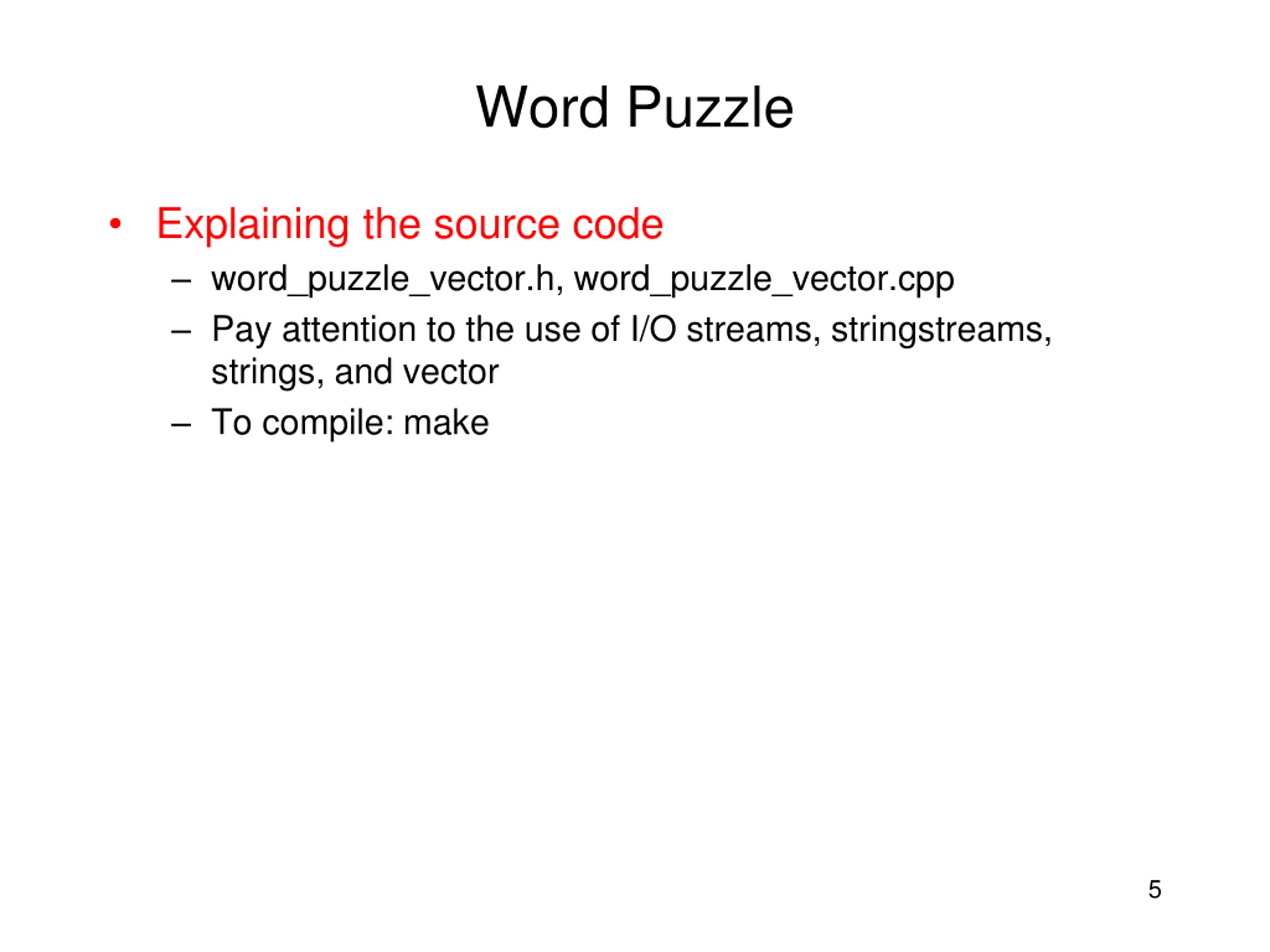 Word Puzzle Explaining the source code word_puzzle_vector.h, word_puzzle_vector.cpp Pay attention to the use of I/O streams, stringstreams, strings, and vector To compile: make 5