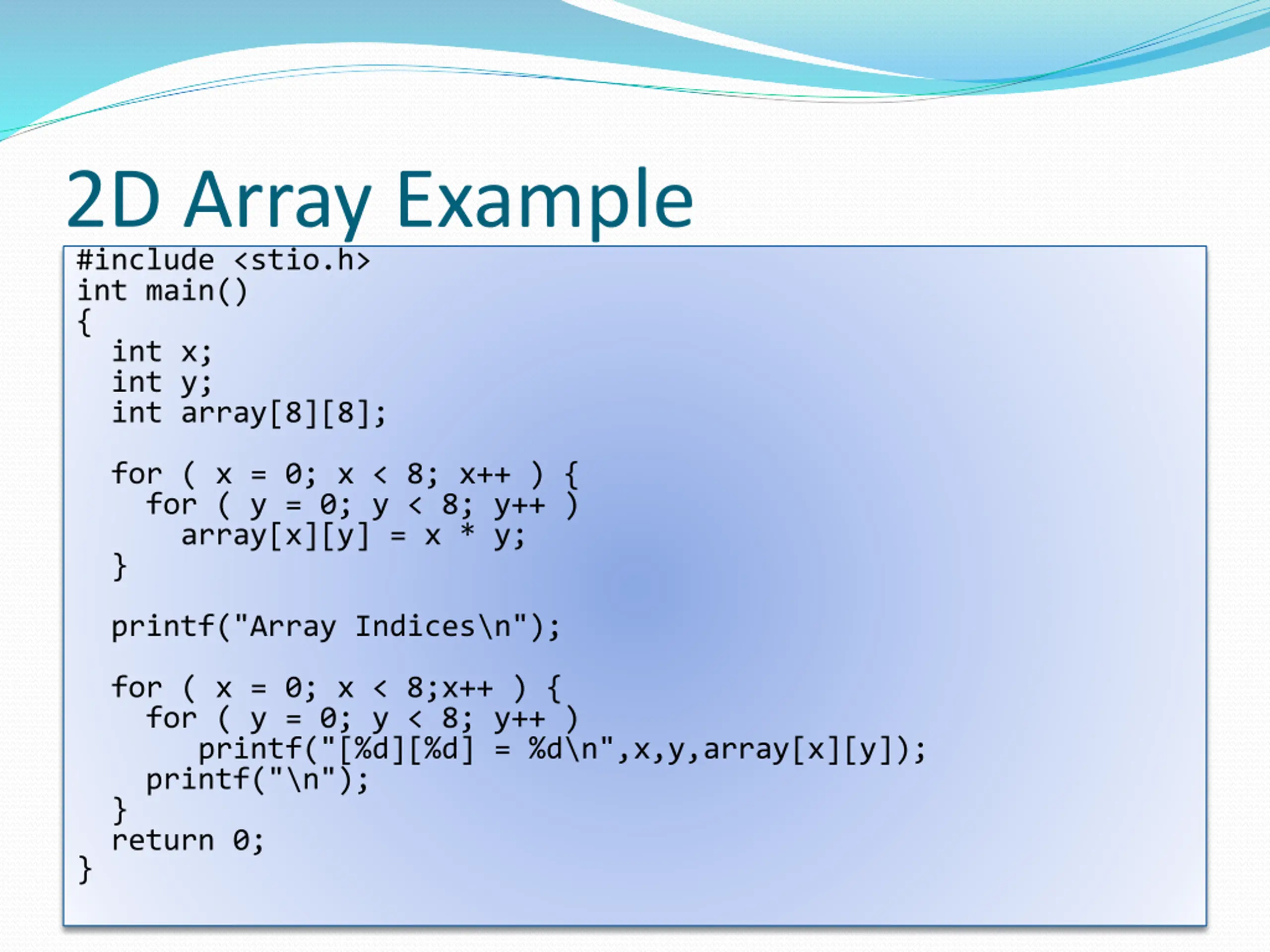 2D Array Example #include <stio.h> int main() { int x; int y; int array[8][8]; for ( x = 0; x < 8; x++ ) { for ( y = 0; y < 8; y++ ) array[x][y] = x * y; } printf("Array Indices\n"); for ( x = 0; x < 8;x++ ) { for ( y = 0; y < 8; y++ ) printf("[%d][%d] = %d\n",x,y,array[x][y]); printf("\n"); } return 0; }