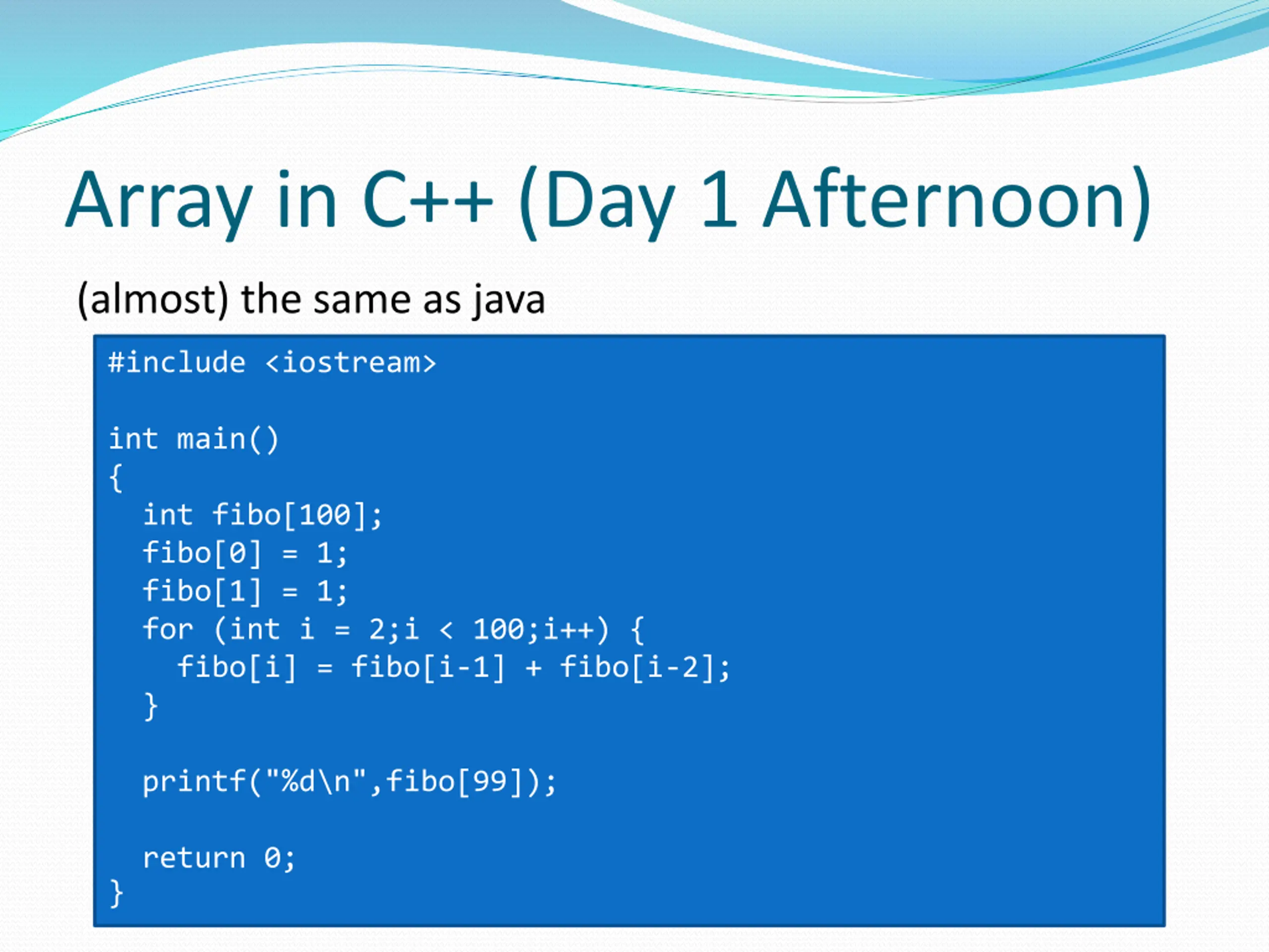 Array in C++ (Day 1 Afternoon) (almost) the same as java #include <iostream> int main() { int fibo[100]; fibo[0] = 1; fibo[1] = 1; for (int i = 2;i < 100;i++) { fibo[i] = fibo[i-1] + fibo[i-2]; } printf("%d\n",fibo[99]); return 0; }