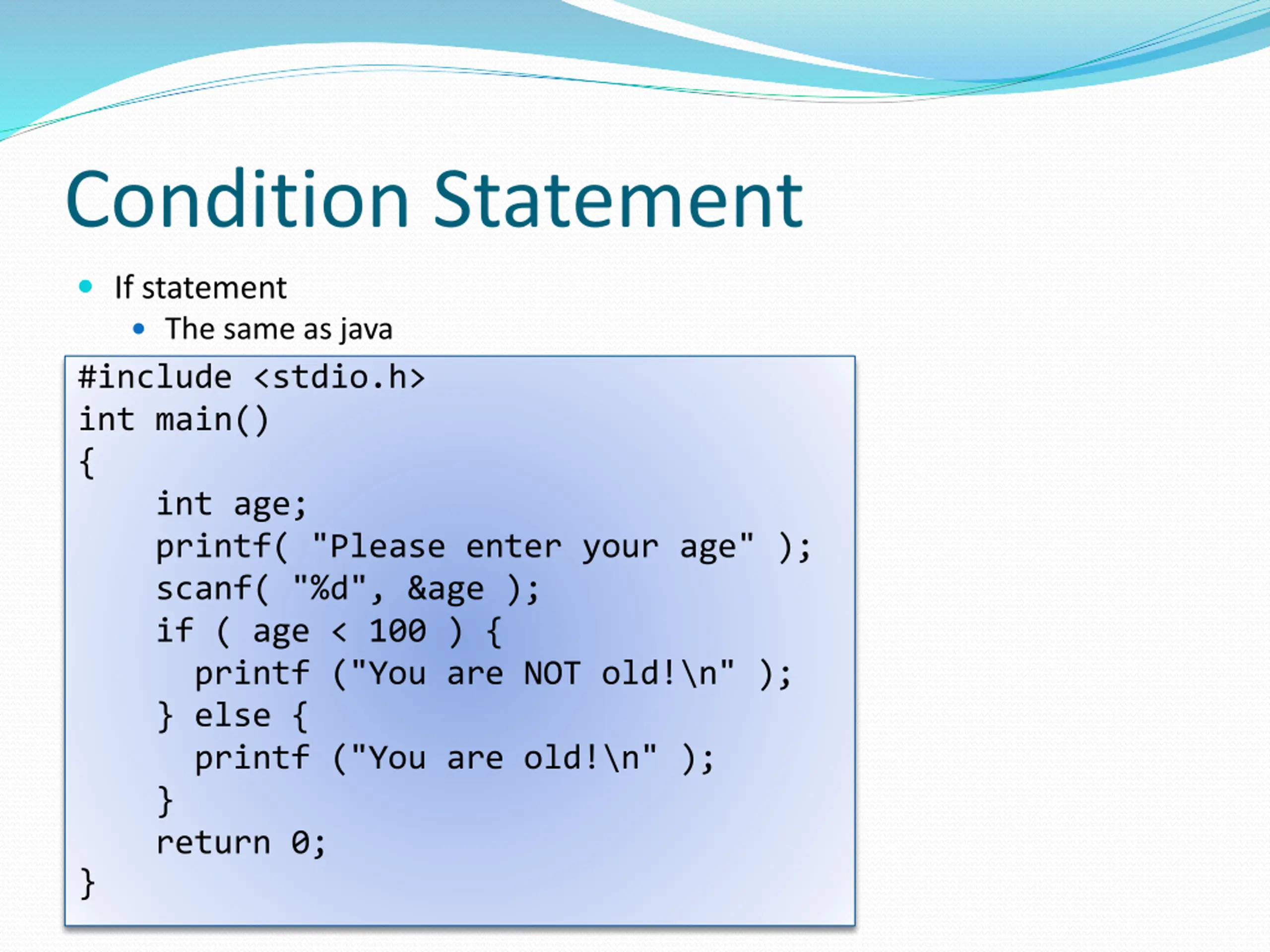 Condition Statement If statement The same as java #include <stdio.h> int main() { int age; printf( "Please enter your age" ); scanf( "%d", &age ); if ( age < 100 ) { printf ("You are NOT old!\n" ); } else { printf ("You are old!\n" ); } return 0; }