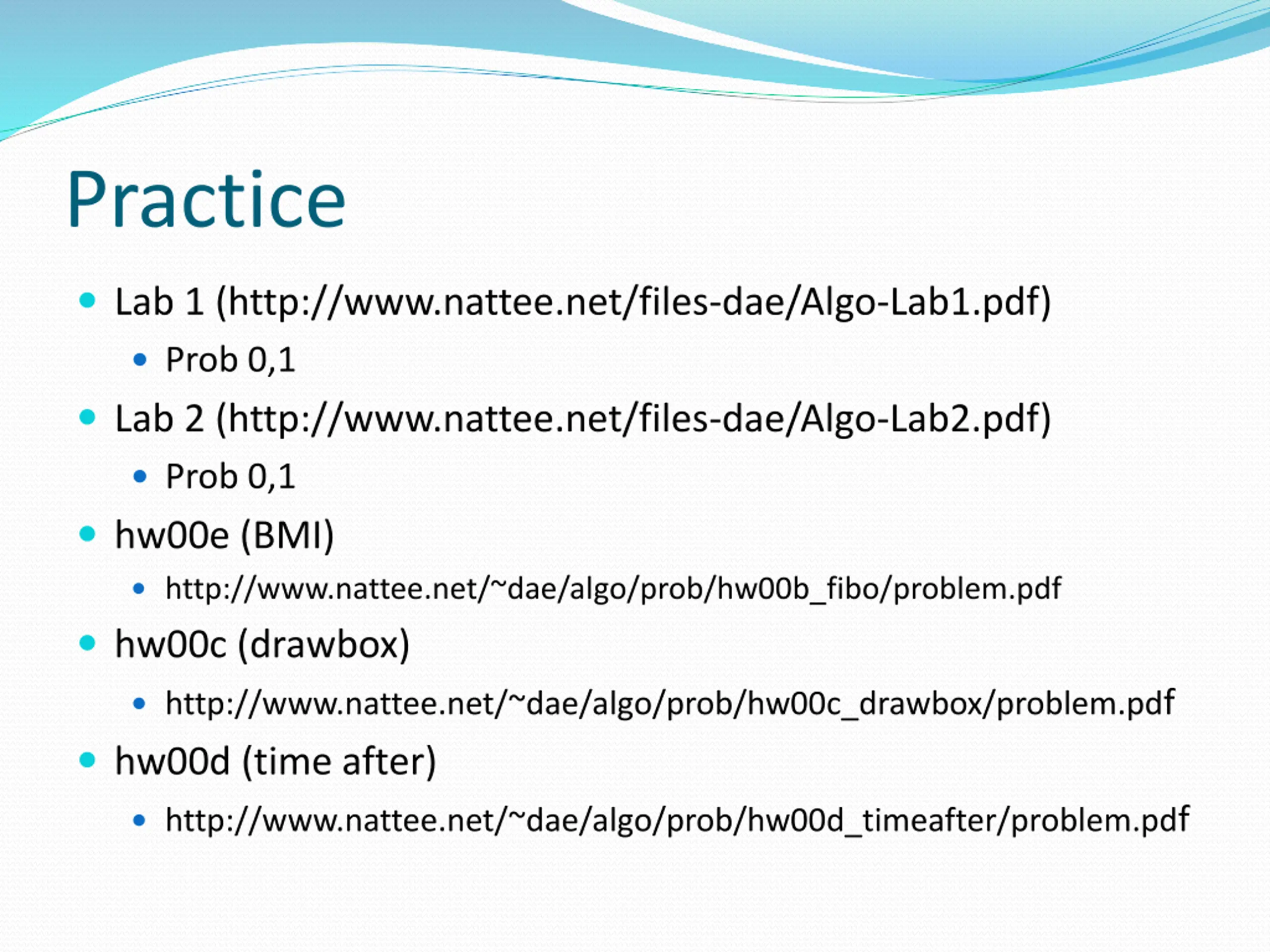 Practice Lab 1 (http://www.nattee.net/files-dae/Algo-Lab1.pdf) Prob 0,1 Lab 2 (http://www.nattee.net/files-dae/Algo-Lab2.pdf) Prob 0,1 hw00e (BMI) http://www.nattee.net/~dae/algo/prob/hw00b_fibo/problem.pdf hw00c (drawbox) http://www.nattee.net/~dae/algo/prob/hw00c_drawbox/problem.pdf hw00d (time after) http://www.nattee.net/~dae/algo/prob/hw00d_timeafter/problem.pdf