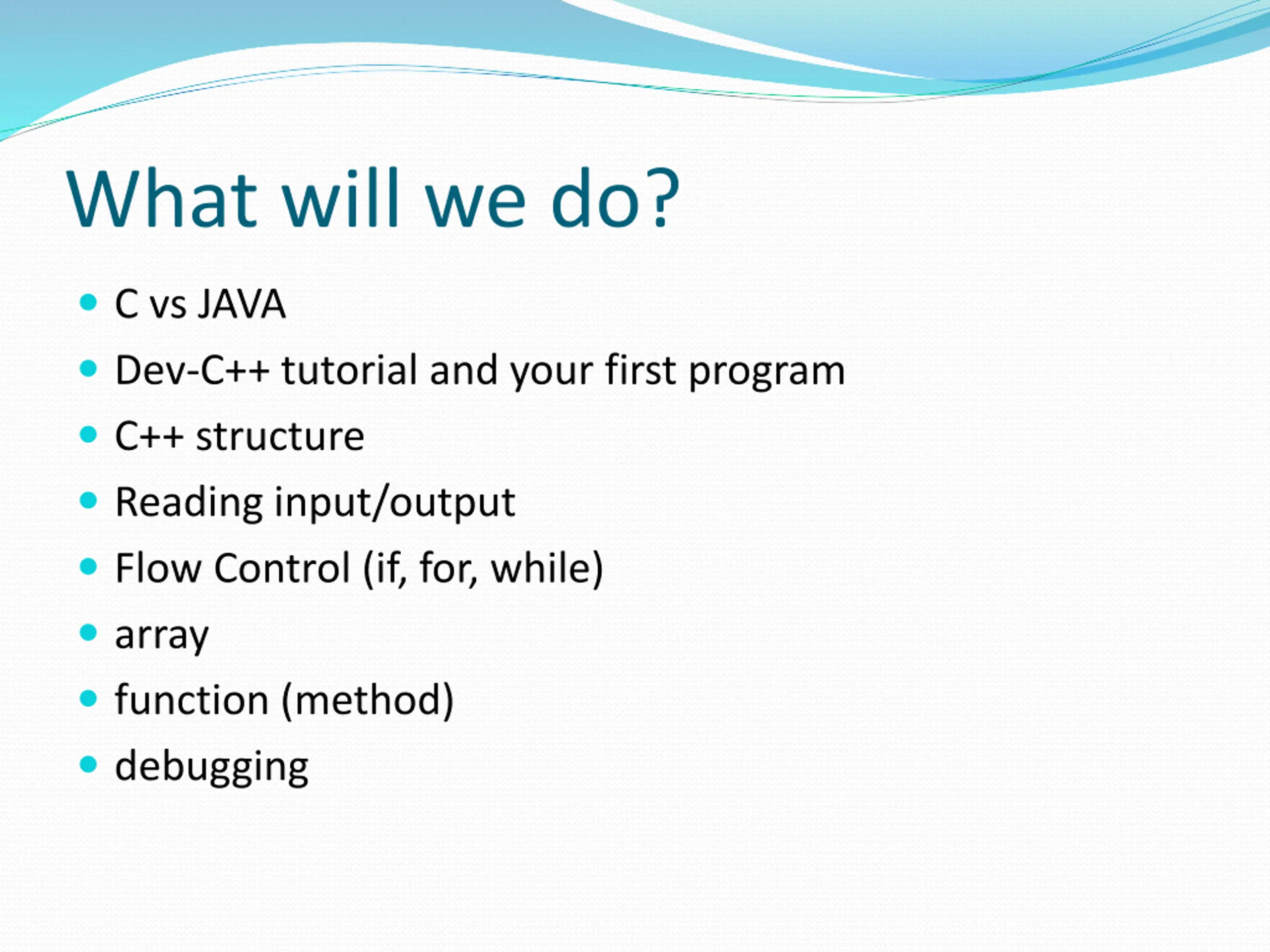 What will we do? C vs JAVA Dev-C++ tutorial and your first program C++ structure Reading input/output Flow Control (if, for, while) array function (method) debugging