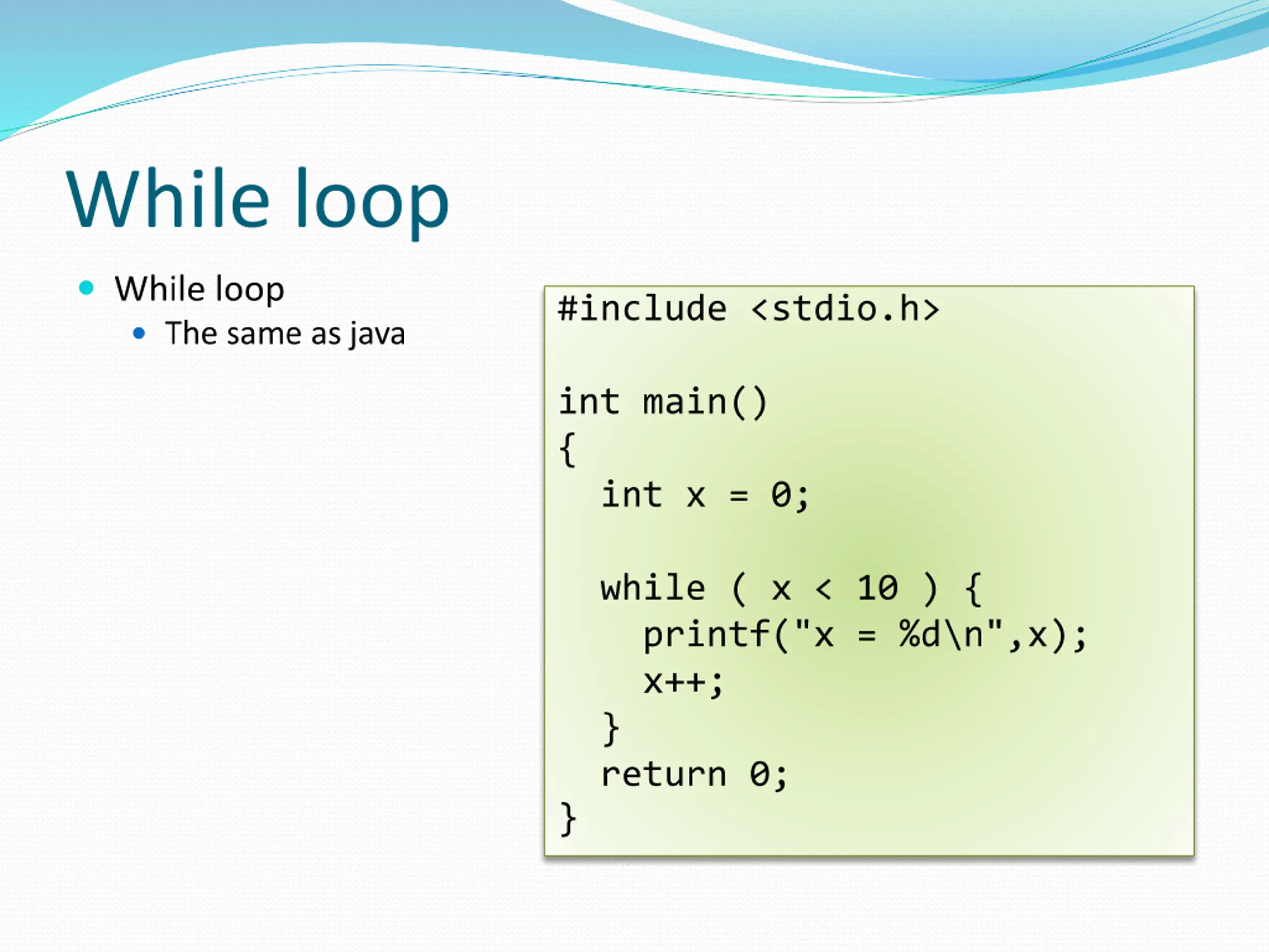 While loop While loop The same as java #include <stdio.h> int main() { int x = 0; while ( x < 10 ) { printf("x = %d\n",x); x++; } return 0; }