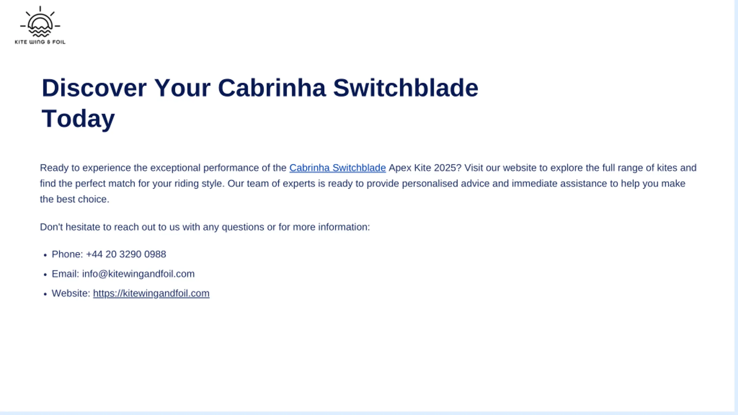 Discover Your Cabrinha Switchblade Today Ready to experience the exceptional performance of the Cabrinha Switchblade Apex Kite 2025? Visit our website to explore the full range of kites and find the perfect match for your riding style. Our team of experts is ready to provide personalised advice and immediate assistance to help you make the best choice. Don't hesitate to reach out to us with any questions or for more information: Phone: +44 20 3290 0988 Email: info@kitewingandfoil.com Website: https://kitewingandfoil.com