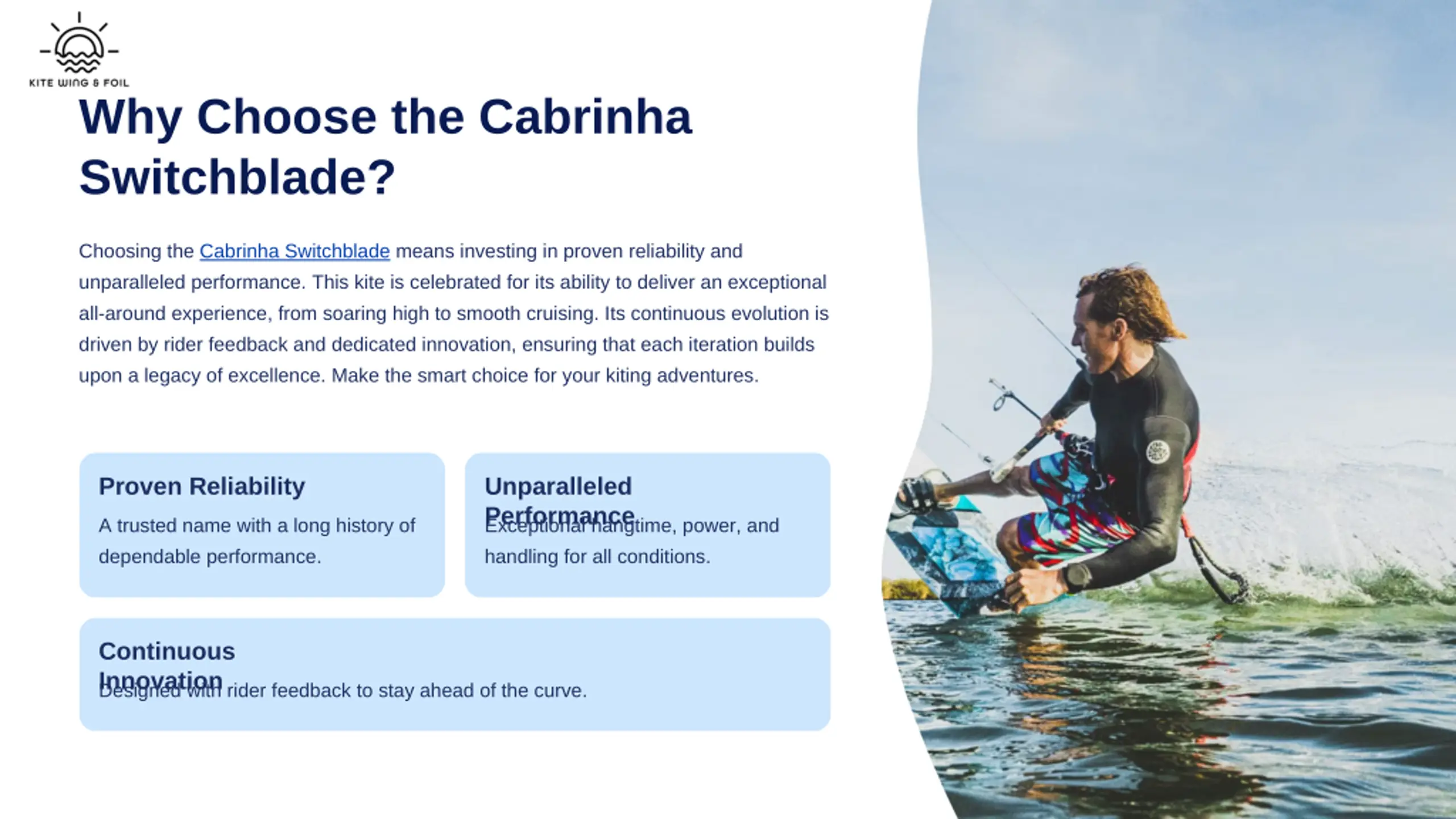 Why Choose the Cabrinha Switchblade? Choosing the Cabrinha Switchblade means investing in proven reliability and unparalleled performance. This kite is celebrated for its ability to deliver an exceptional all-around experience, from soaring high to smooth cruising. Its continuous evolution is driven by rider feedback and dedicated innovation, ensuring that each iteration builds upon a legacy of excellence. Make the smart choice for your kiting adventures. Proven Reliability Unparalleled Performance Exceptional hangtime, power, and handling for all conditions. A trusted name with a long history of dependable performance. Continuous Innovation Designed with rider feedback to stay ahead of the curve.