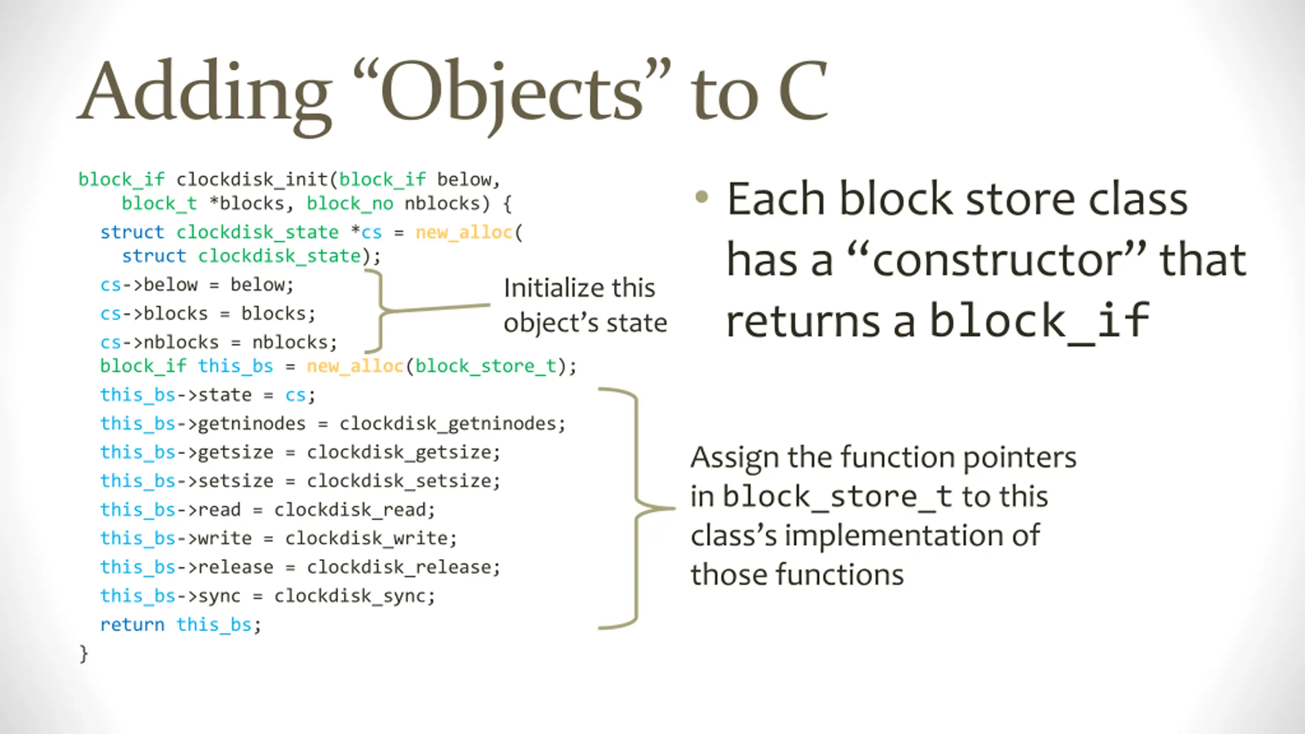 Adding Objects to C Each block store class has a constructor that returns a block_if block_if clockdisk_init(block_if below, block_t *blocks, block_no nblocks) { struct clockdisk_state *cs = new_alloc( struct clockdisk_state); cs->below = below; cs->blocks = blocks; cs->nblocks = nblocks; block_if this_bs = new_alloc(block_store_t); this_bs->state = cs; this_bs->getninodes = clockdisk_getninodes; this_bs->getsize = clockdisk_getsize; this_bs->setsize = clockdisk_setsize; this_bs->read = clockdisk_read; this_bs->write = clockdisk_write; this_bs->release = clockdisk_release; this_bs->sync = clockdisk_sync; return this_bs; } Initialize this object s state Assign the function pointers in block_store_t to this class s implementation of those functions