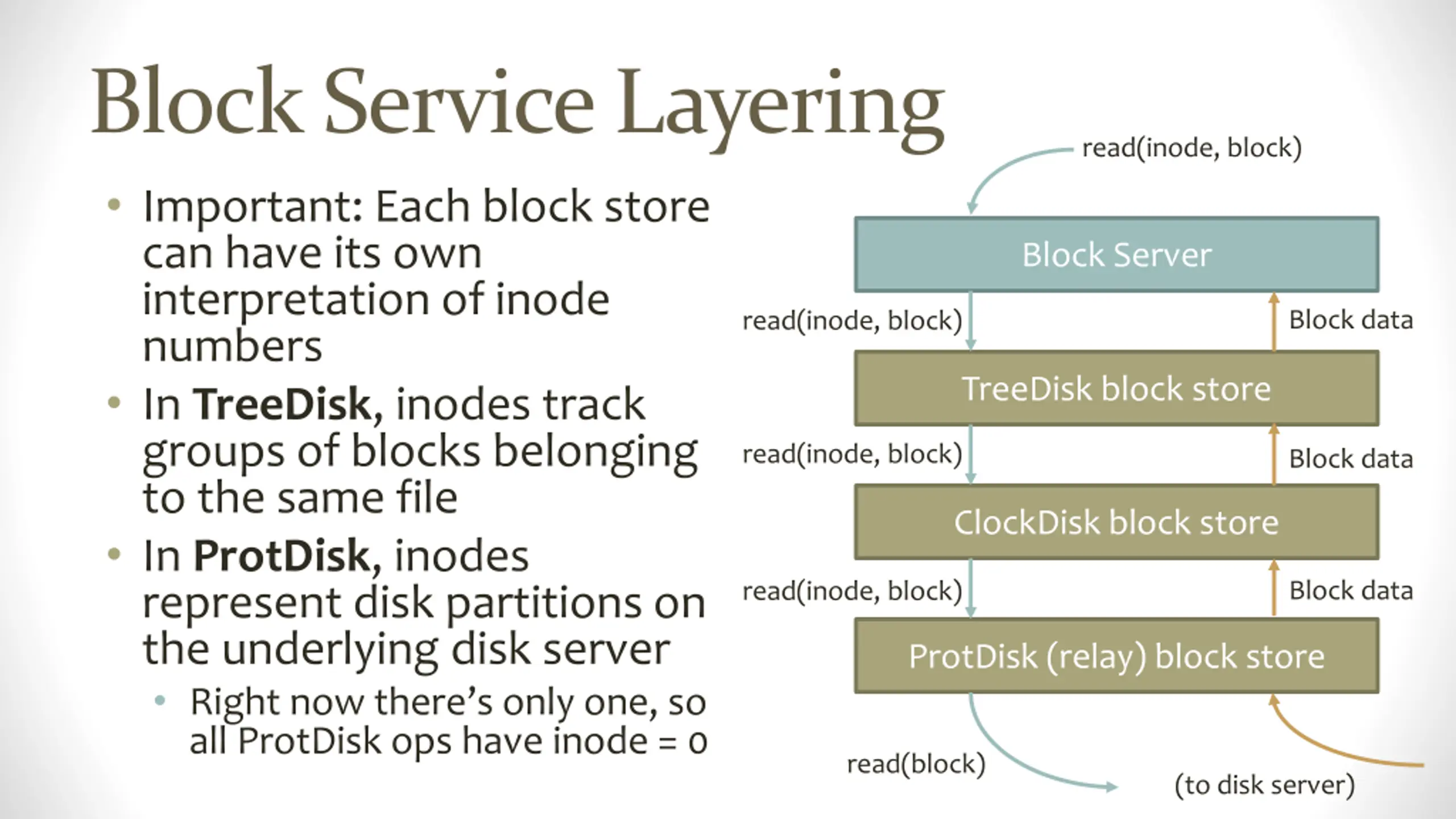 Block Service Layering Important: Each block store can have its own interpretation of inode numbers In TreeDisk, inodes track groups of blocks belonging to the same file In ProtDisk, inodes represent disk partitions on the underlying disk server Right now there s only one, so all ProtDisk ops have inode = 0 read(inode, block) Block Server Block data read(inode, block) TreeDisk block store read(inode, block) Block data ClockDisk block store Block data read(inode, block) ProtDisk (relay) block store read(block) (to disk server)