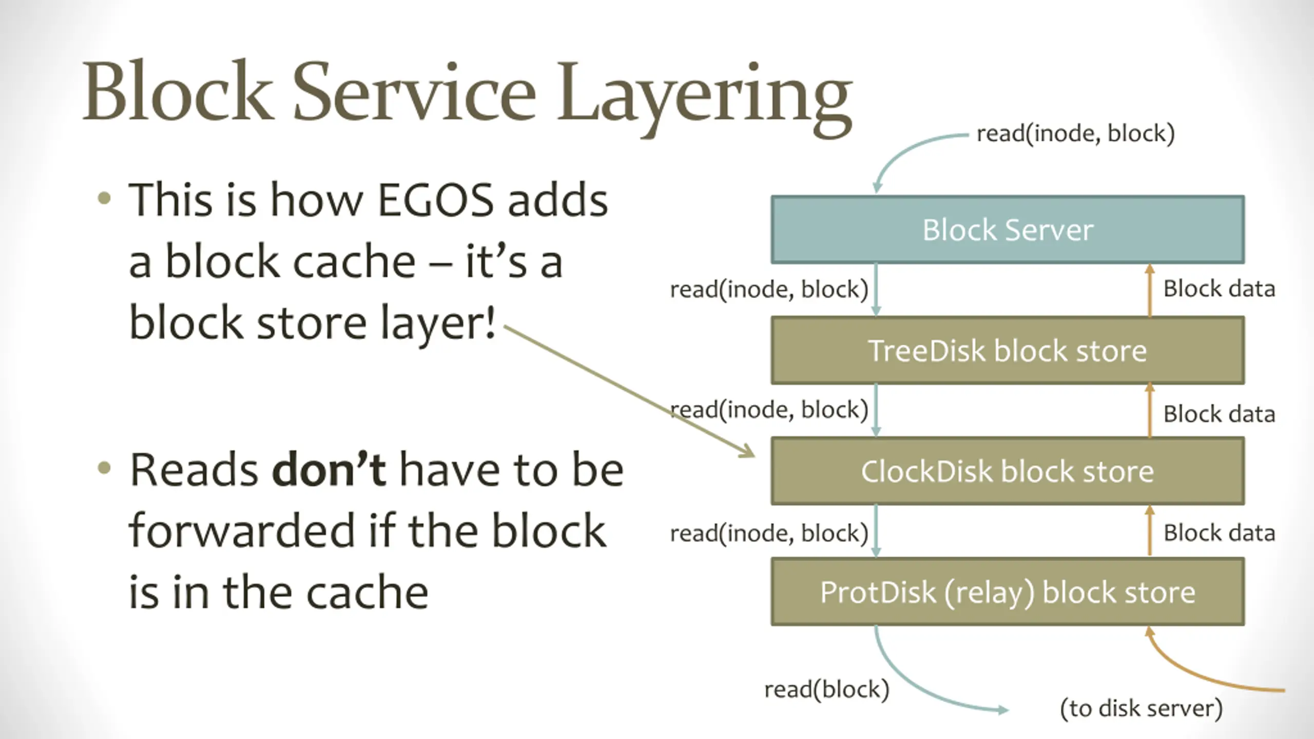 Block Service Layering read(inode, block) This is how EGOS adds a block cache it s a block store layer! Block Server Block data read(inode, block) TreeDisk block store read(inode, block) Block data Reads don t have to be forwarded if the block is in the cache ClockDisk block store Block data read(inode, block) ProtDisk (relay) block store read(block) (to disk server)