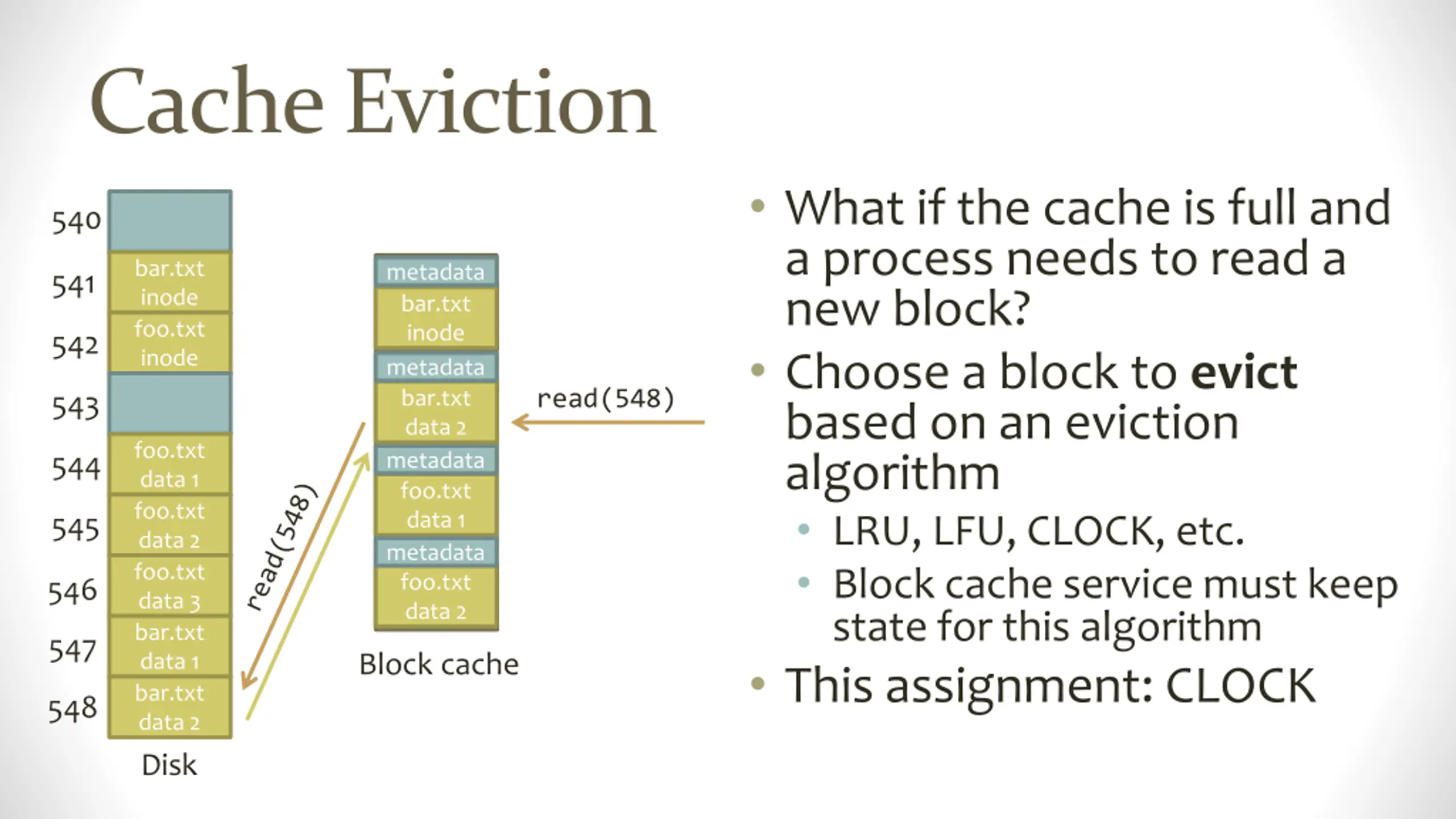 Cache Eviction What if the cache is full and a process needs to read a new block? Choose a block to evict based on an eviction algorithm LRU, LFU, CLOCK, etc. Block cache service must keep state for this algorithm This assignment: CLOCK 540 bar.txt inode foo.txt inode metadata 541 bar.txt inode metadata 542 read(548) foo.txt inode metadata bar.txt data 2 543 foo.txt data 1 foo.txt data 2 foo.txt data 3 bar.txt data 1 bar.txt data 2 Disk 544 foo.txt data 1 metadata 545 foo.txt data 2 546 547 Block cache 548