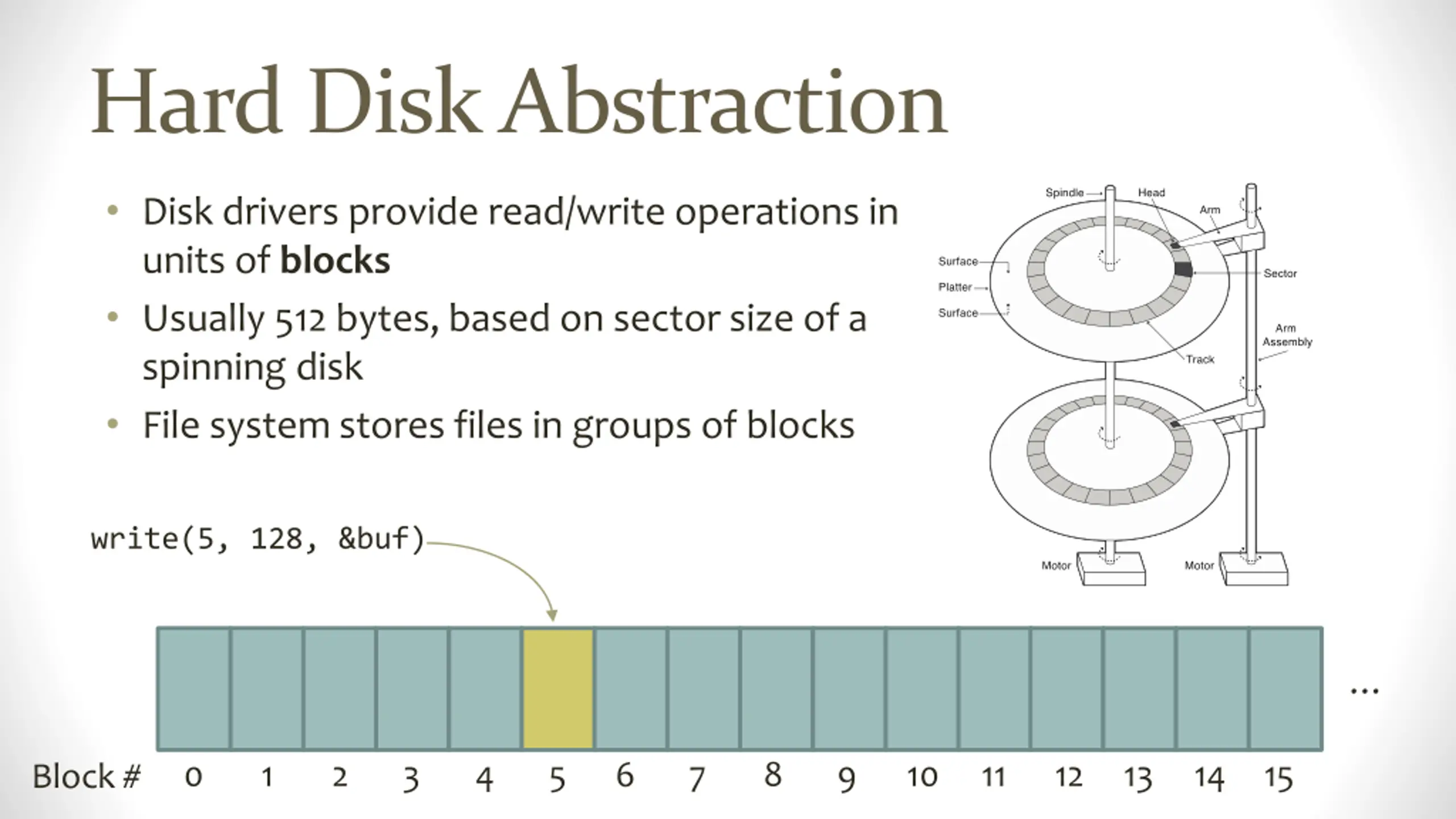 Hard Disk Abstraction Disk drivers provide read/write operations in units of blocks Usually 512 bytes, based on sector size of a spinning disk File system stores files in groups of blocks write(5, 128, &buf) 0 1 2 3 4 5 6 7 8 9 10 11 12 13 14 15 Block #