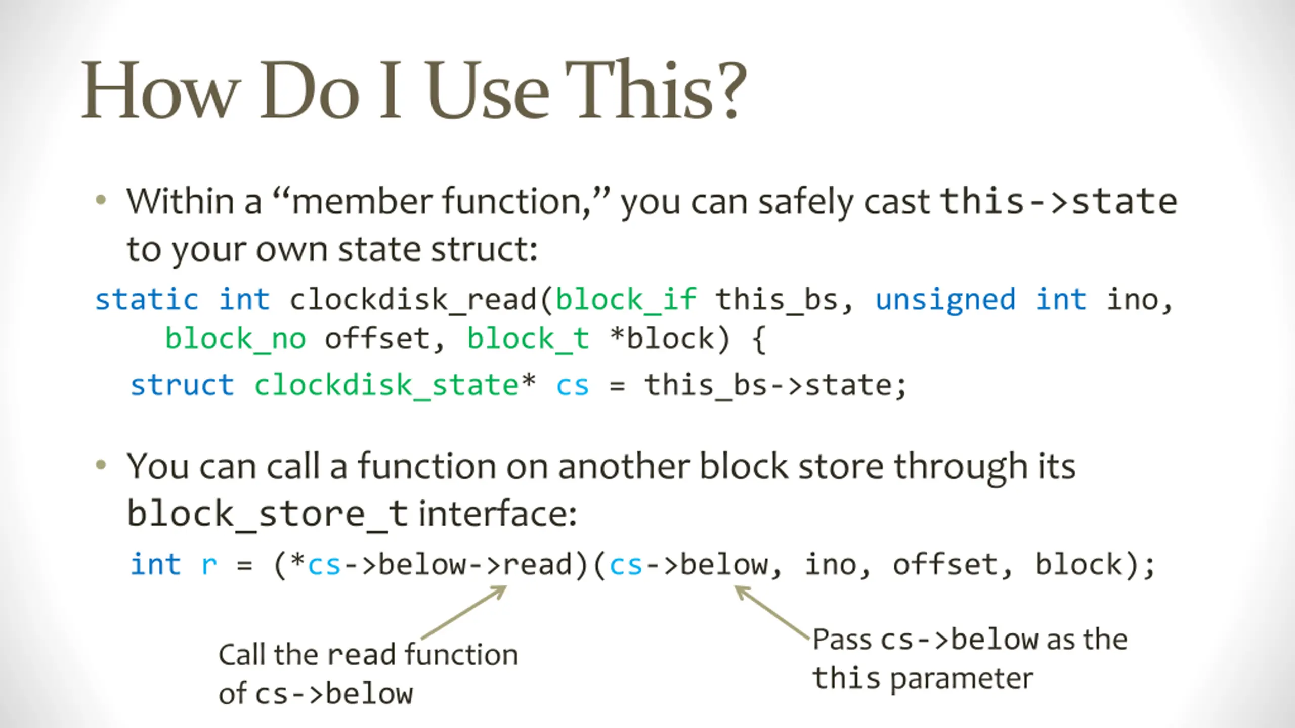 How Do I Use This? Within a member function, you can safely cast this->state to your own state struct: static int clockdisk_read(block_if this_bs, unsigned int ino, block_no offset, block_t *block) { struct clockdisk_state* cs = this_bs->state; You can call a function on another block store through its block_store_t interface: int r = (*cs->below->read)(cs->below, ino, offset, block); Pass cs->below as the this parameter Call the read function of cs->below