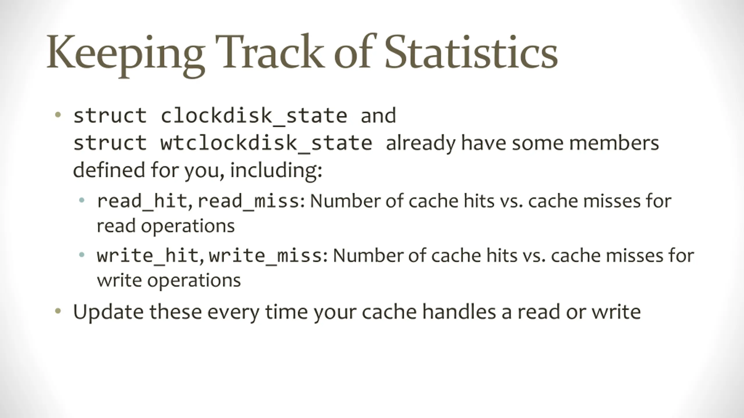 Keeping Track of Statistics struct clockdisk_state and struct wtclockdisk_state already have some members defined for you, including: read_hit, read_miss: Number of cache hits vs. cache misses for read operations write_hit, write_miss: Number of cache hits vs. cache misses for write operations Update these every time your cache handles a read or write