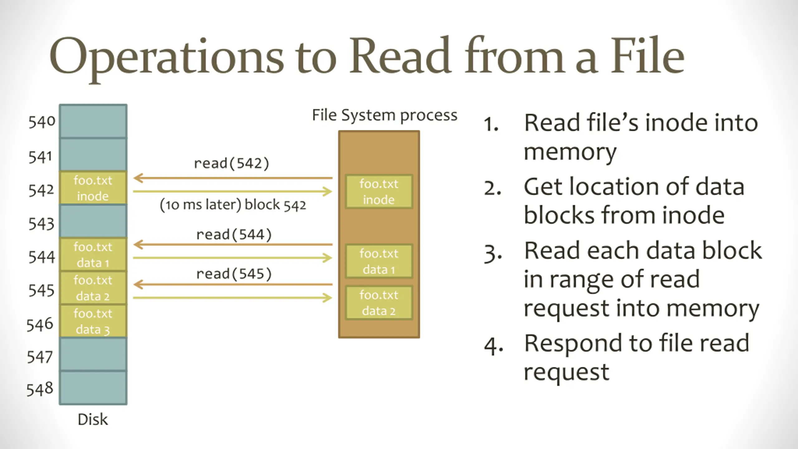 Operations to Read from a File File System process 1. Read file s inode into memory 2. Get location of data blocks from inode 3. Read each data block in range of read request into memory 4. Respond to file read request 540 541 read(542) foo.txt inode foo.txt inode 542 (1o ms later) block 542 543 read(544) foo.txt data 1 foo.txt data 2 foo.txt data 3 544 foo.txt data 1 read(545) 545 foo.txt data 2 546 547 548 Disk