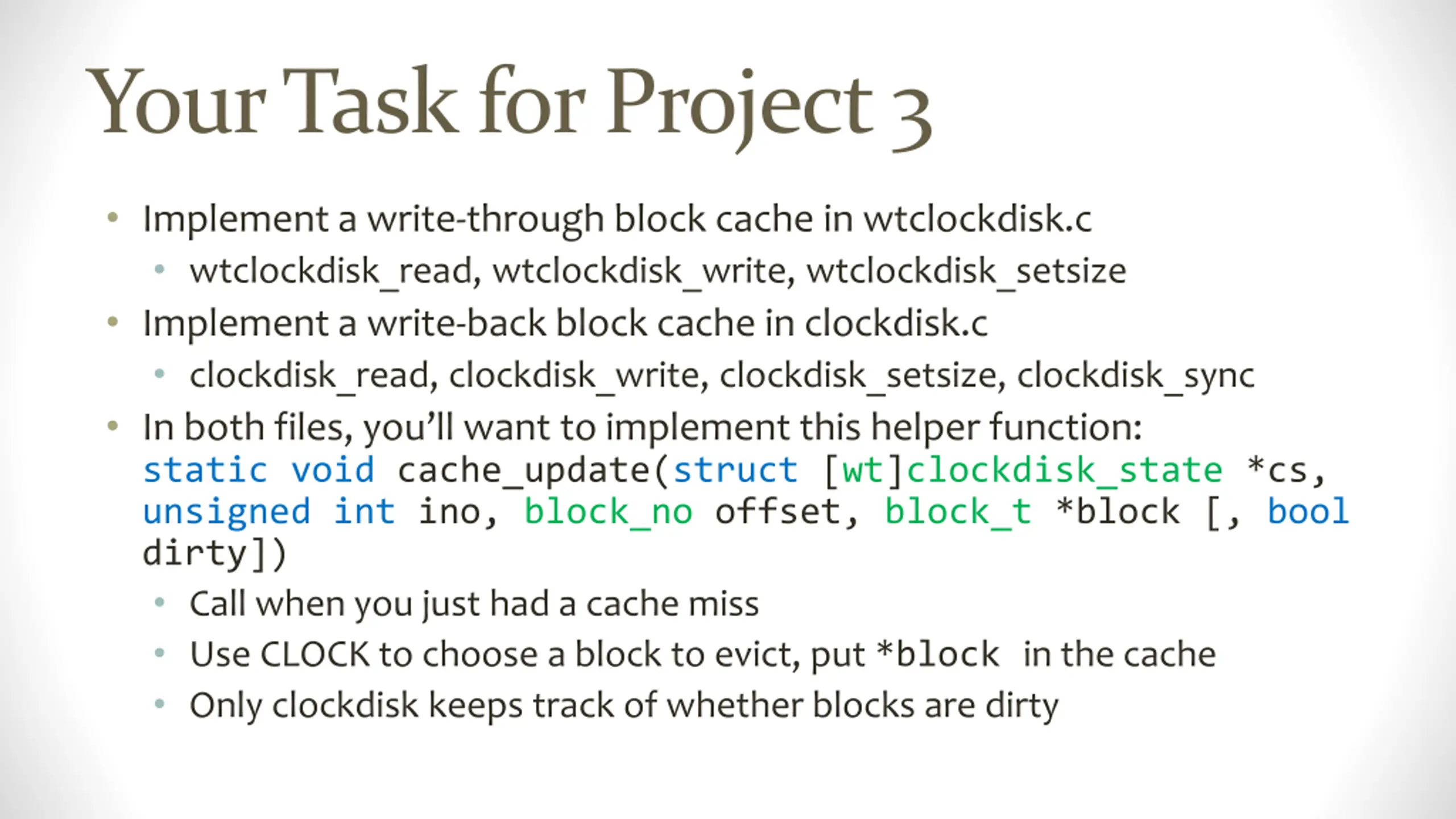 Your Task for Project 3 Implement a write-through block cache in wtclockdisk.c wtclockdisk_read, wtclockdisk_write, wtclockdisk_setsize Implement a write-back block cache in clockdisk.c clockdisk_read, clockdisk_write, clockdisk_setsize, clockdisk_sync In both files, you ll want to implement this helper function: static void cache_update(struct [wt]clockdisk_state *cs, unsigned int ino, block_no offset, block_t *block [, bool dirty]) Call when you just had a cache miss Use CLOCK to choose a block to evict, put *block in the cache Only clockdisk keeps track of whether blocks are dirty