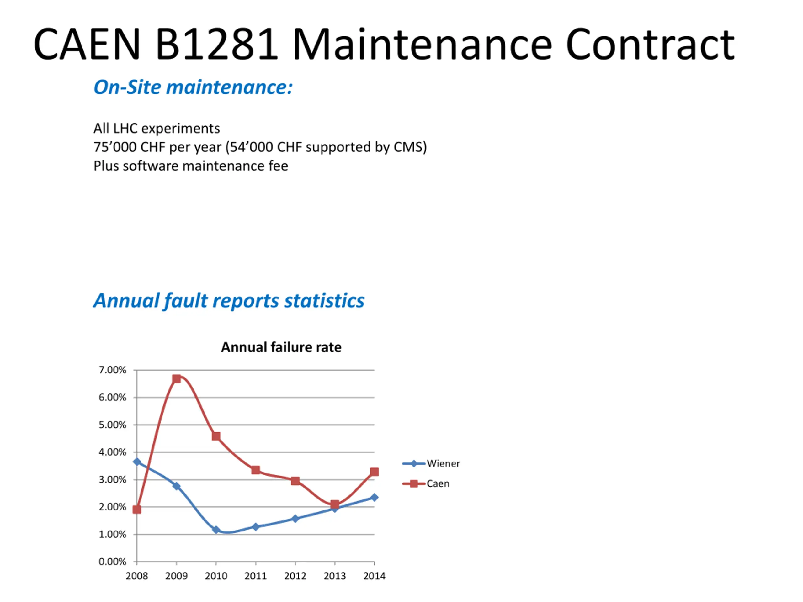CAEN contracts up-to-now Running smoothly Appreciated by users Stable failure rate since 2010 (~3%, no sign of wearout) Acceptable turn-around time (avg 30 days) Stock of critical components available ~Monthly visits and meetings Costly Probably no change till 2019 Annual fault reports statistics Annual failure rate 7.00% 6.00% 5.00% 4.00% Wiener 3.00% Caen 2.00% 1.00% 0.00% 2008 2009 2010 2011 2012 2013 2014