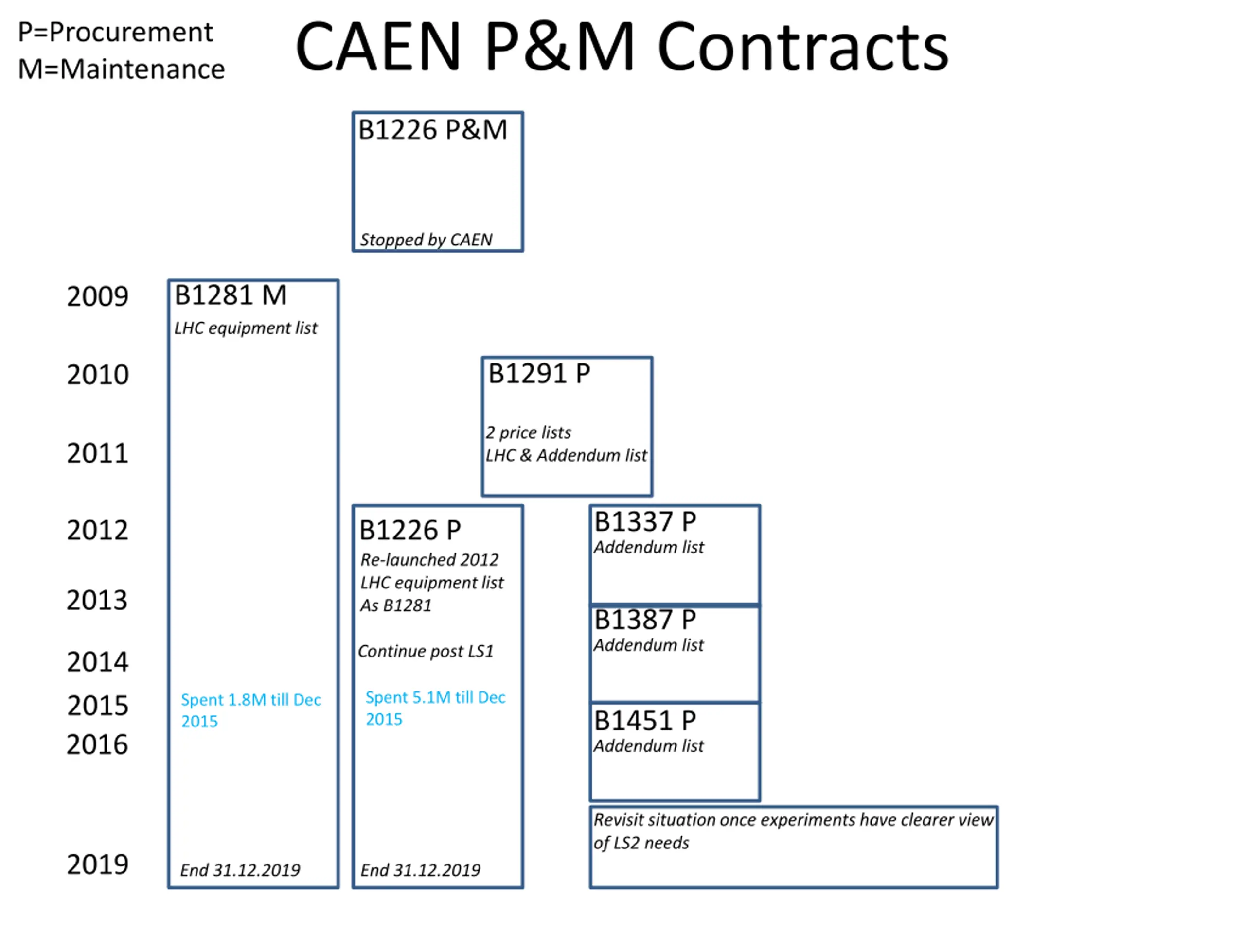 P=Procurement M=Maintenance CAEN P&M Contracts B1226 P&M Stopped by CAEN B1281 M LHC equipmentlist 2009 B1291 P 2010 2 price lists LHC & Addendum list 2011 B1337 P Addendum list 2012 B1226 P Re-launched 2012 LHC equipmentlist As B1281 2013 B1387 P Addendum list Continue post LS1 2014 2015 2016 Spent 5.1M till Dec 2015 Spent 1.8M till Dec 2015 B1451 P Addendum list Revisitsituation once experimentshave clearer view of LS2 needs 2019 End 31.12.2019 End 31.12.2019