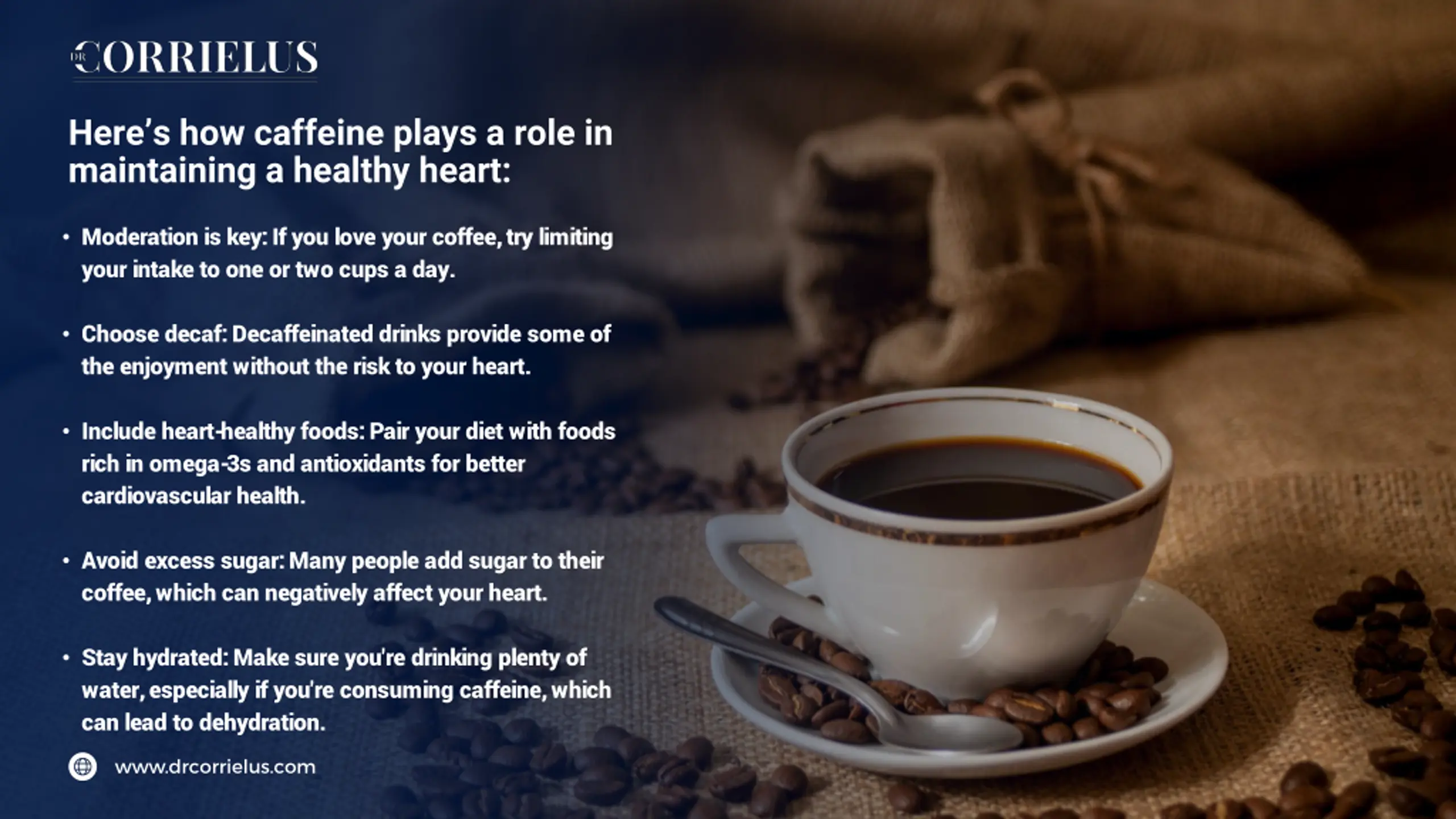 Heres how caffeine plays a role in maintaining a healthy heart: Moderation is key: If you love your coffee, try limiting your intake to one or two cups a day. Choose decaf: Decaffeinated drinks provide some of the enjoyment without the risk to your heart. Include heart-healthy foods: Pair your diet with foods rich in omega-3s and antioxidants for better cardiovascular health. Avoid excess sugar: Many people add sugar to their coffee, which can negatively affect your heart. Stay hydrated: Make sure you're drinking plenty of water, especially if you're consuming caffeine, which can lead to dehydration. www.drcorrielus.com