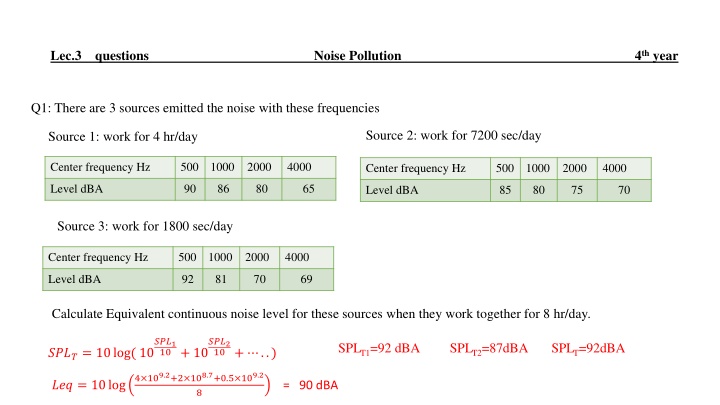 This document discusses the calculation of the equivalent continuous noise level (LAeq) from various sources operating under different conditions. It includes examples of noise levels generated by machinery and trains over specified time periods. Key calculations involve the use of dBA levels and operational times, emphasizing the impact of combined noise emissions on overall environmental noise levels. The content also addresses the permissible exposure limits for workers in noisy environments, ensuring safety standards are met.