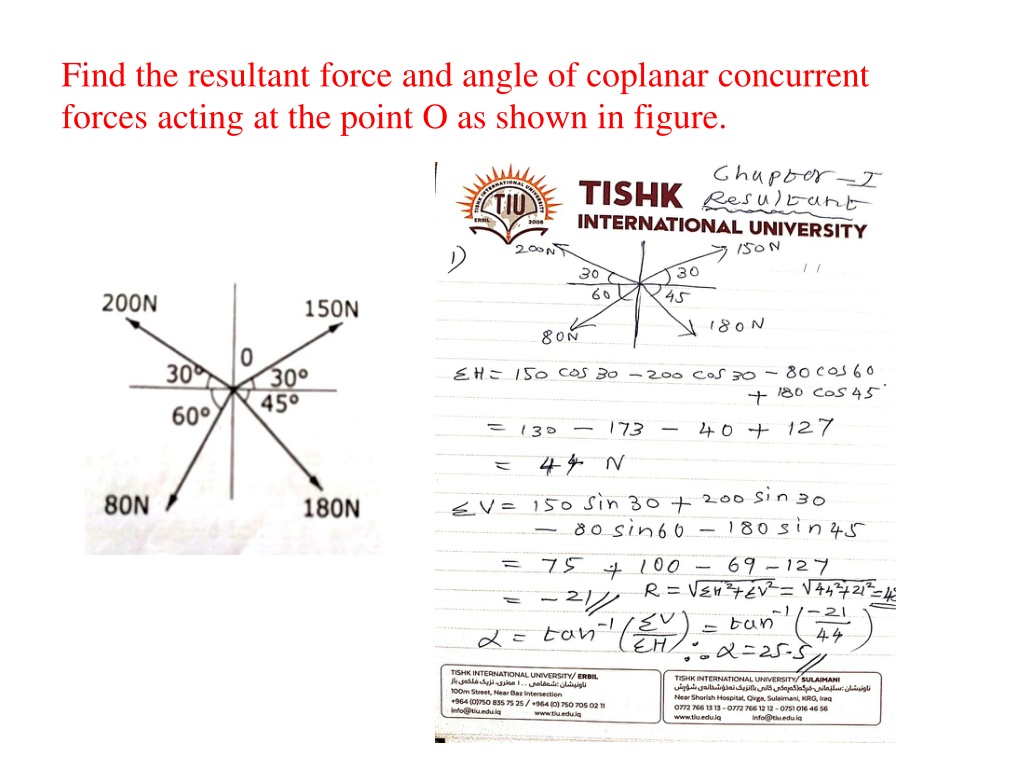 Find the resultant force and angle of coplanar concurrent forces acting at the point O as shown in figure.