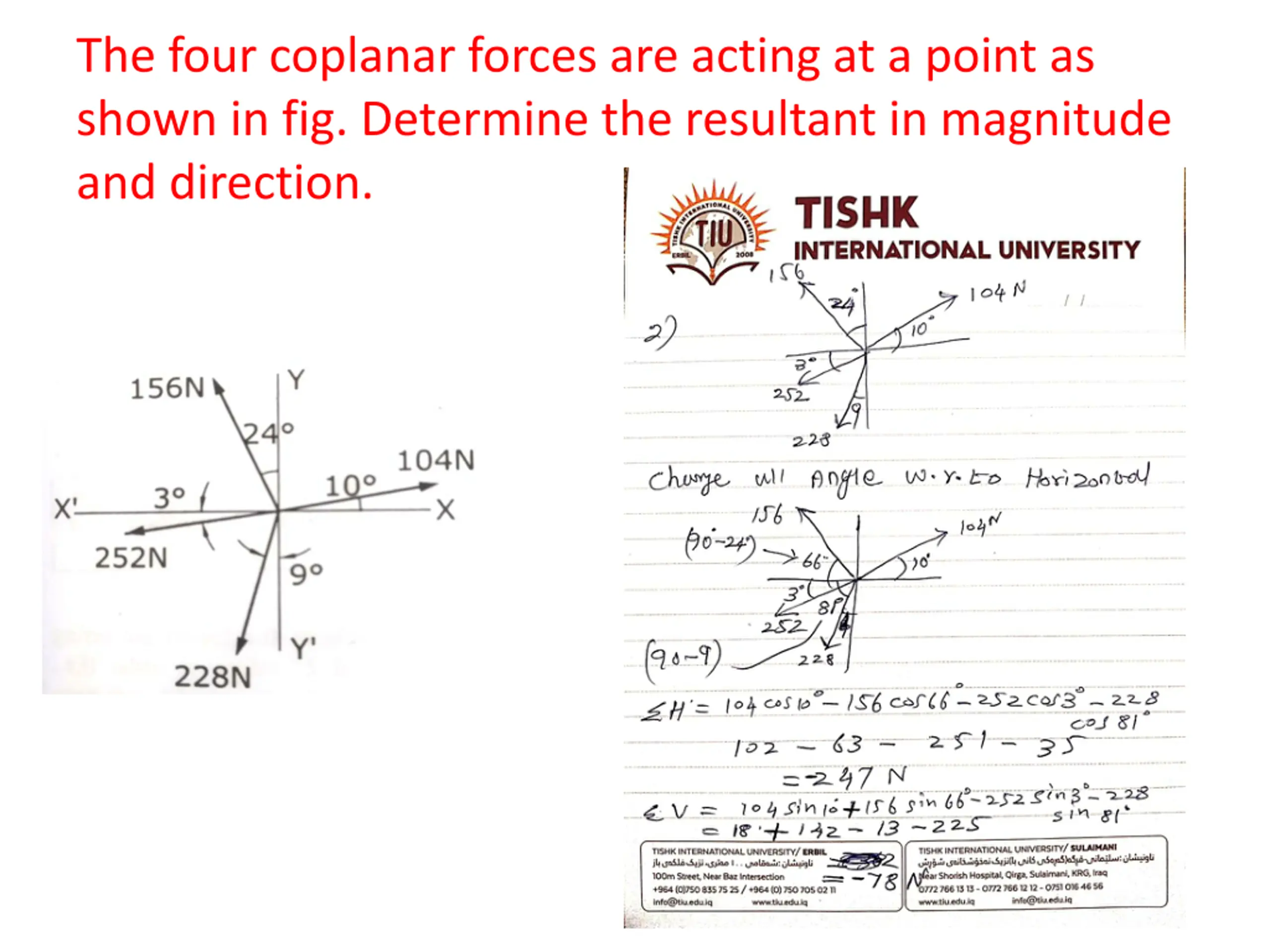 The four coplanar forces are acting at a point as shown in fig. Determine the resultant in magnitude and direction.