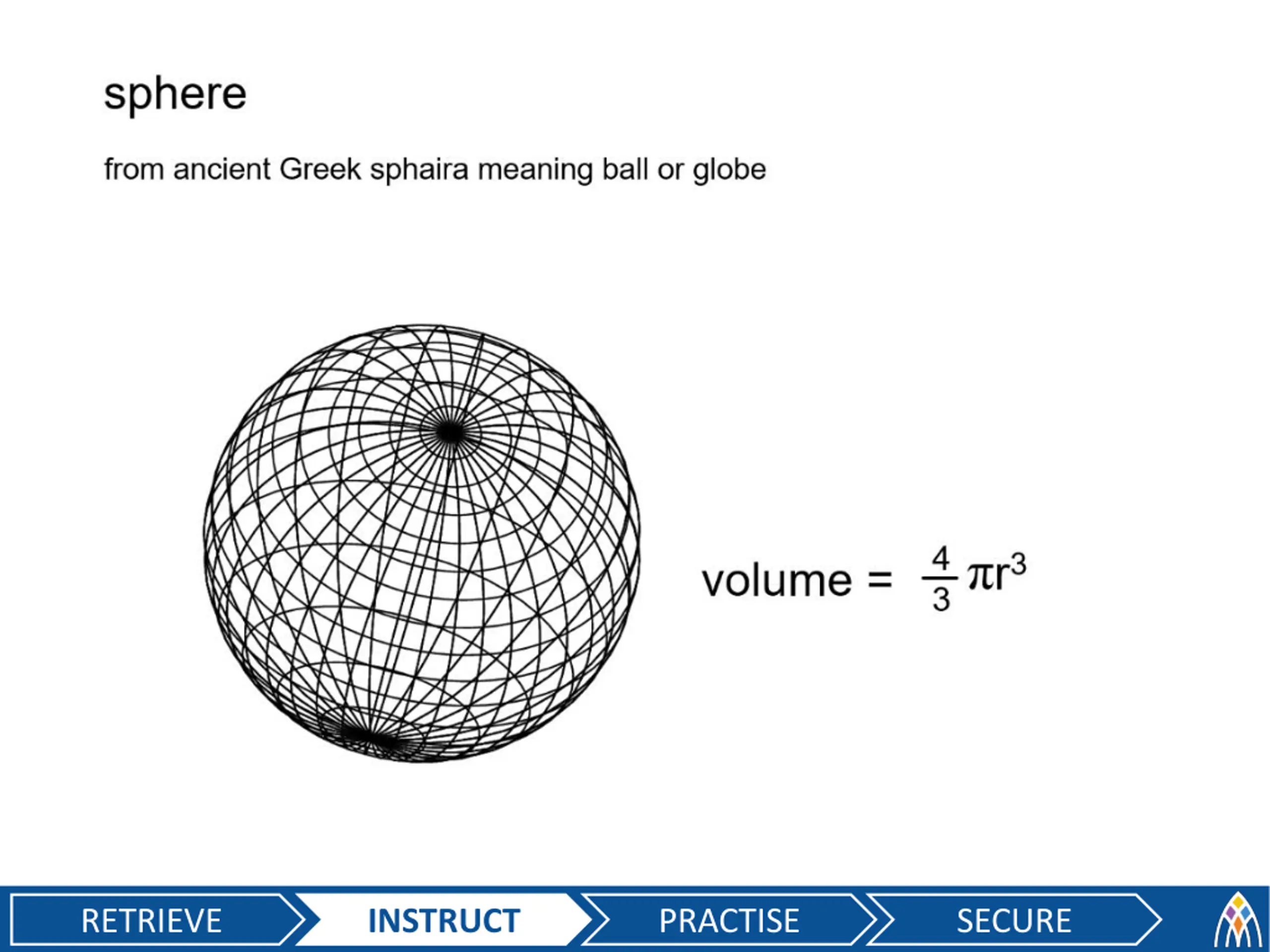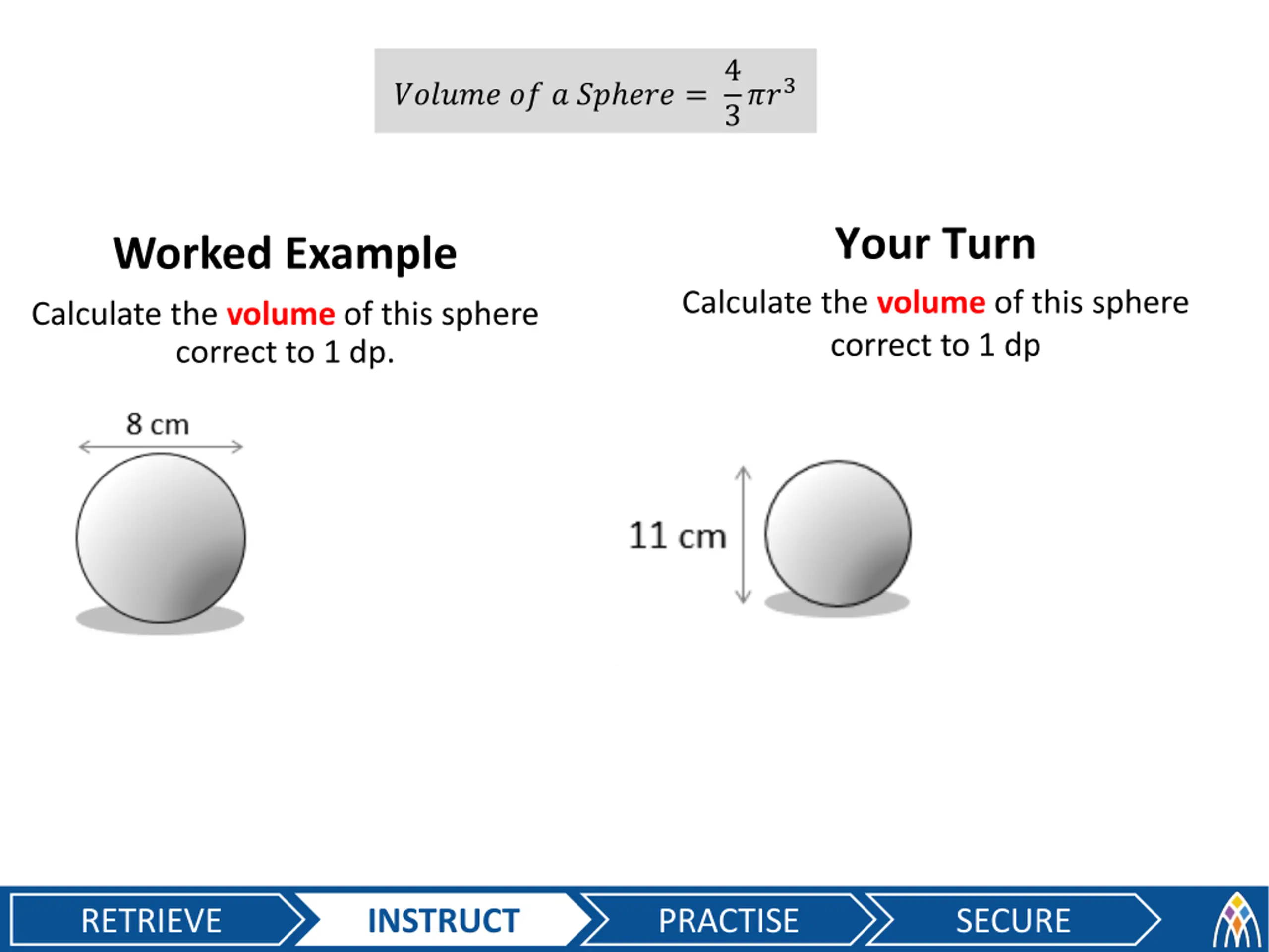 4 3??3 ?????? ?? ? ?? ??? = Your Turn Worked Example Calculate the volume of this sphere correct to 1 dp. Calculate the volume of this sphere correct to 1 dp RETRIEVE INSTRUCT PRACTISE SECURE