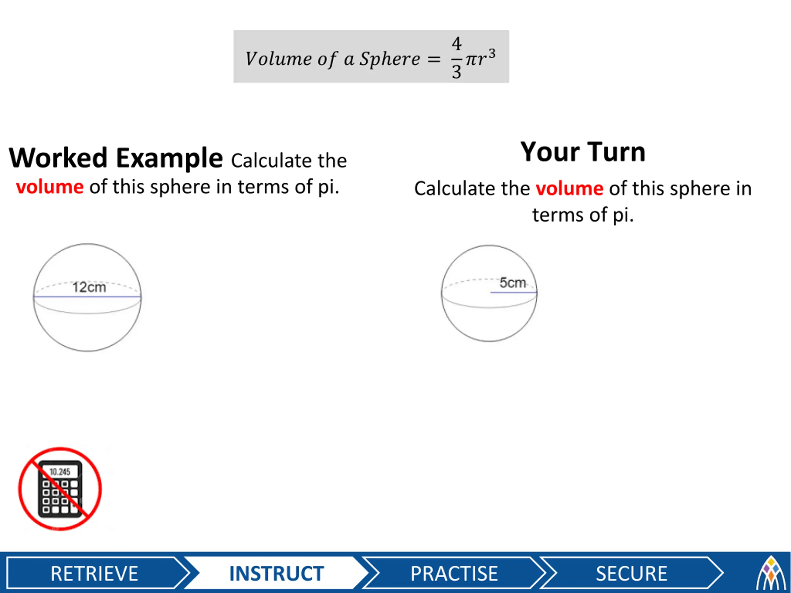 4 3??3 ?????? ?? ? ?? ??? = Your Turn Worked Example Calculate the volume of this sphere in terms of pi. Calculate the volume of this sphere in terms of pi. RETRIEVE INSTRUCT PRACTISE SECURE