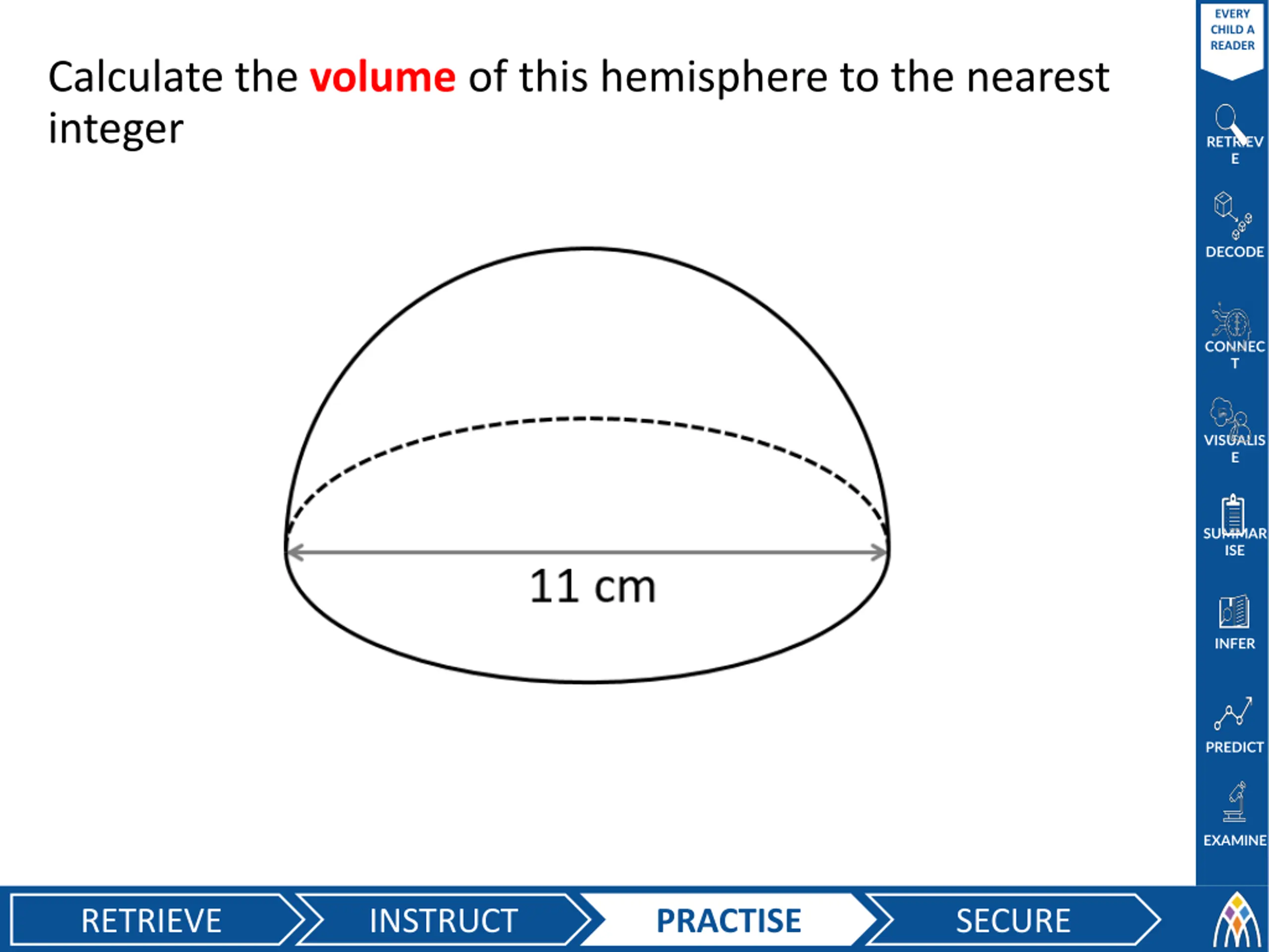 EVERY CHILD A READER Calculate the volume of this hemisphere to the nearest integer RETRIEV E DECODE CONNEC T VISUALIS E SUMMAR ISE INFER PREDICT EXAMINE RETRIEVE INSTRUCT PRACTISE SECURE
