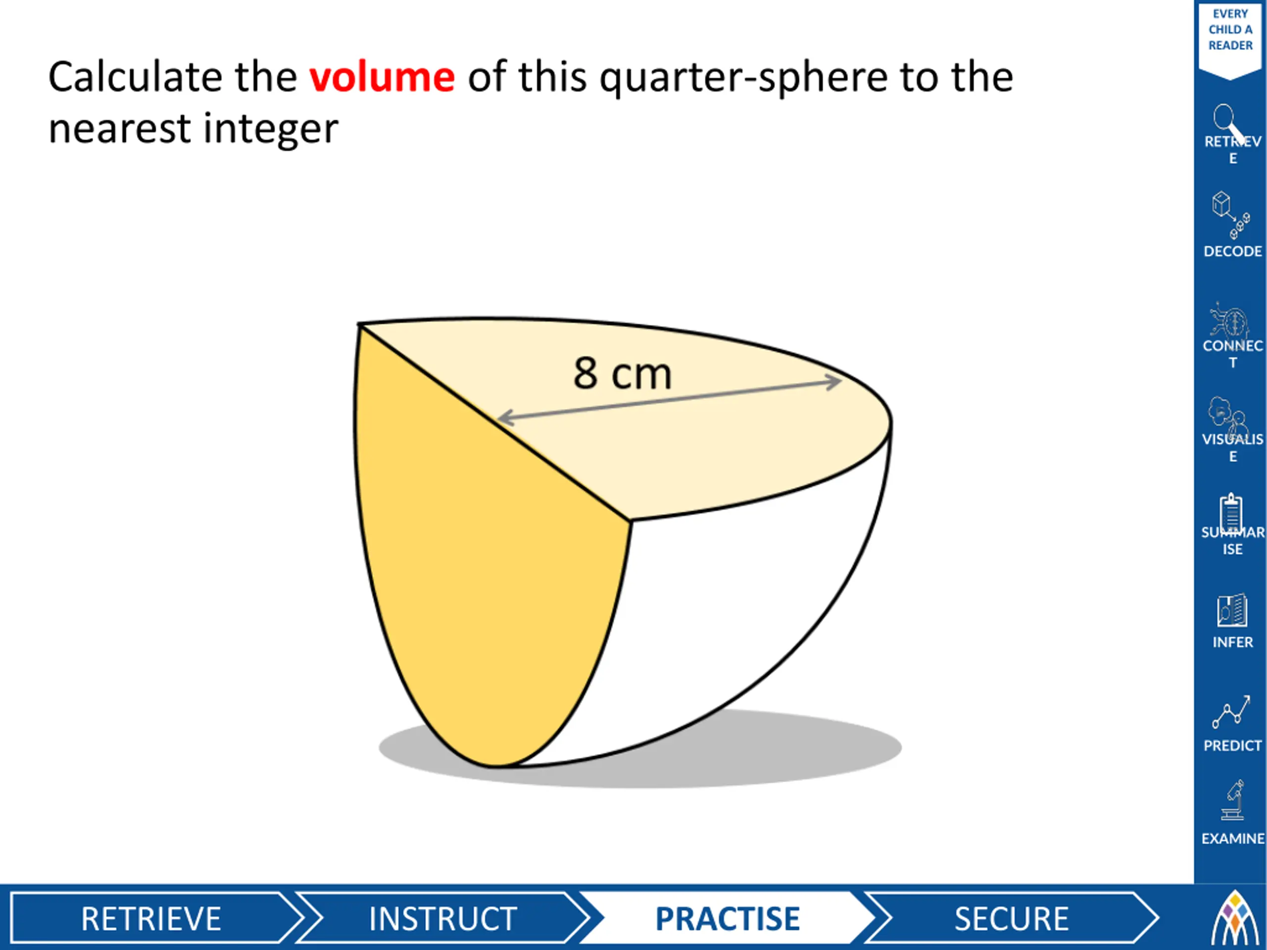 EVERY CHILD A READER Calculate the volume of this quarter-sphere to the nearest integer RETRIEV E DECODE CONNEC T VISUALIS E SUMMAR ISE INFER PREDICT EXAMINE RETRIEVE INSTRUCT PRACTISE SECURE