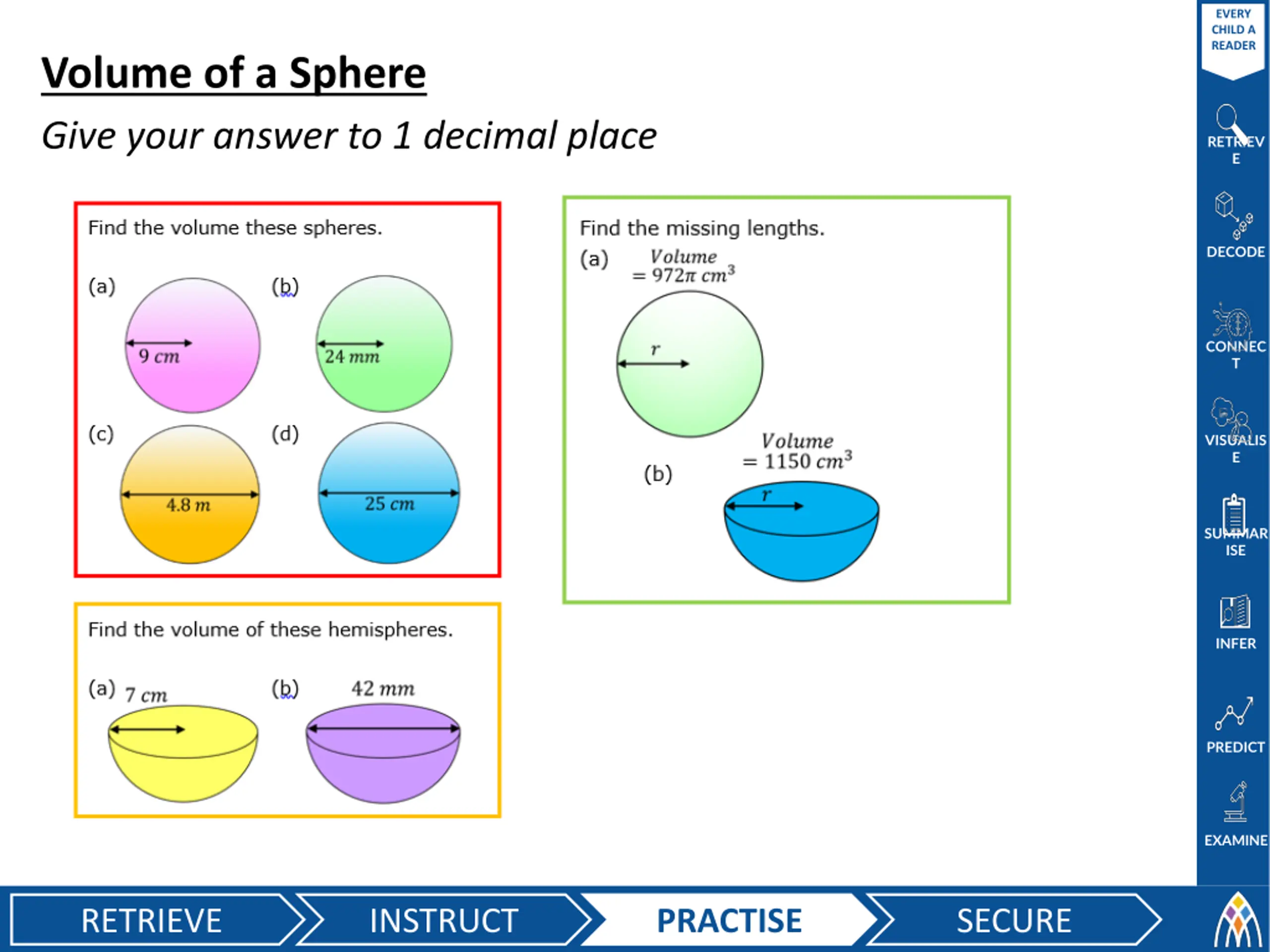 EVERY CHILD A READER Volume of a Sphere Give your answer to 1 decimal place RETRIEV E DECODE CONNEC T VISUALIS E SUMMAR ISE INFER PREDICT EXAMINE RETRIEVE INSTRUCT PRACTISE SECURE