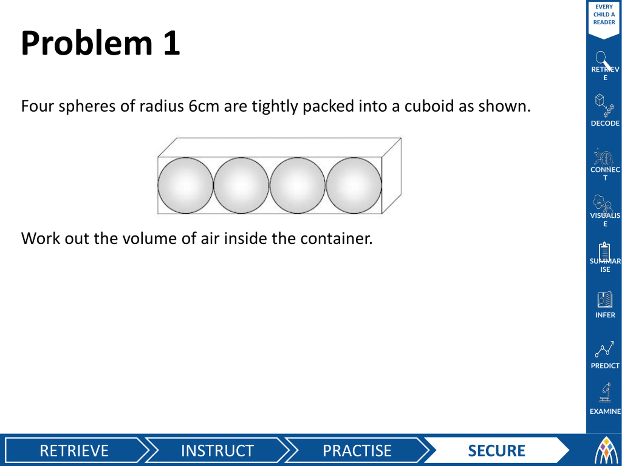 EVERY CHILD A READER Problem 1 RETRIEV E Four spheres of radius 6cm are tightly packed into a cuboid as shown. DECODE CONNEC T VISUALIS E Work out the volume of air inside the container. SUMMAR ISE INFER PREDICT EXAMINE RETRIEVE INSTRUCT PRACTISE SECURE