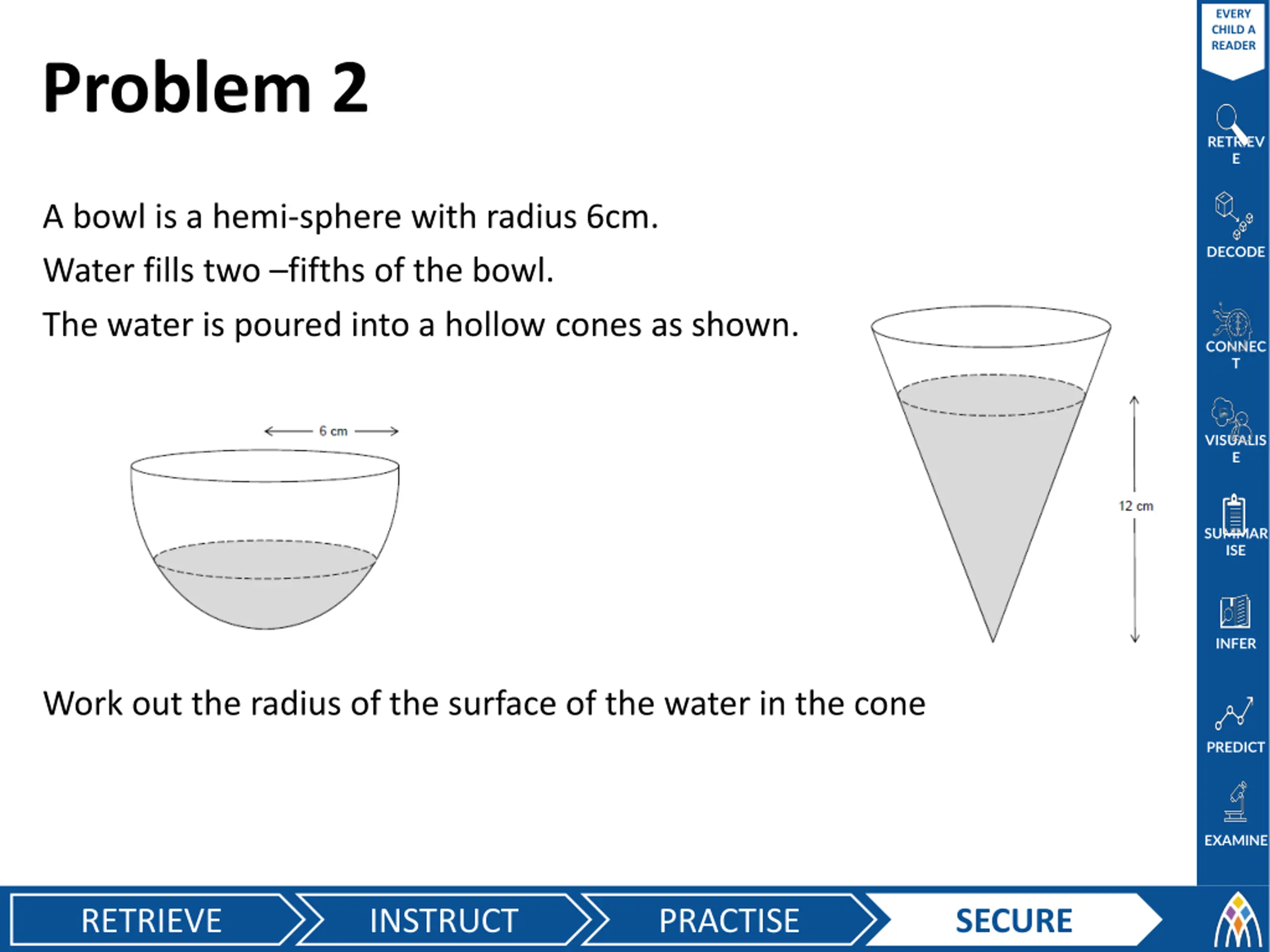 EVERY CHILD A READER Problem 2 RETRIEV E A bowl is a hemi-sphere with radius 6cm. Water fills two fifths of the bowl. The water is poured into a hollow cones as shown. DECODE CONNEC T VISUALIS E SUMMAR ISE INFER Work out the radius of the surface of the water in the cone PREDICT EXAMINE RETRIEVE INSTRUCT PRACTISE SECURE