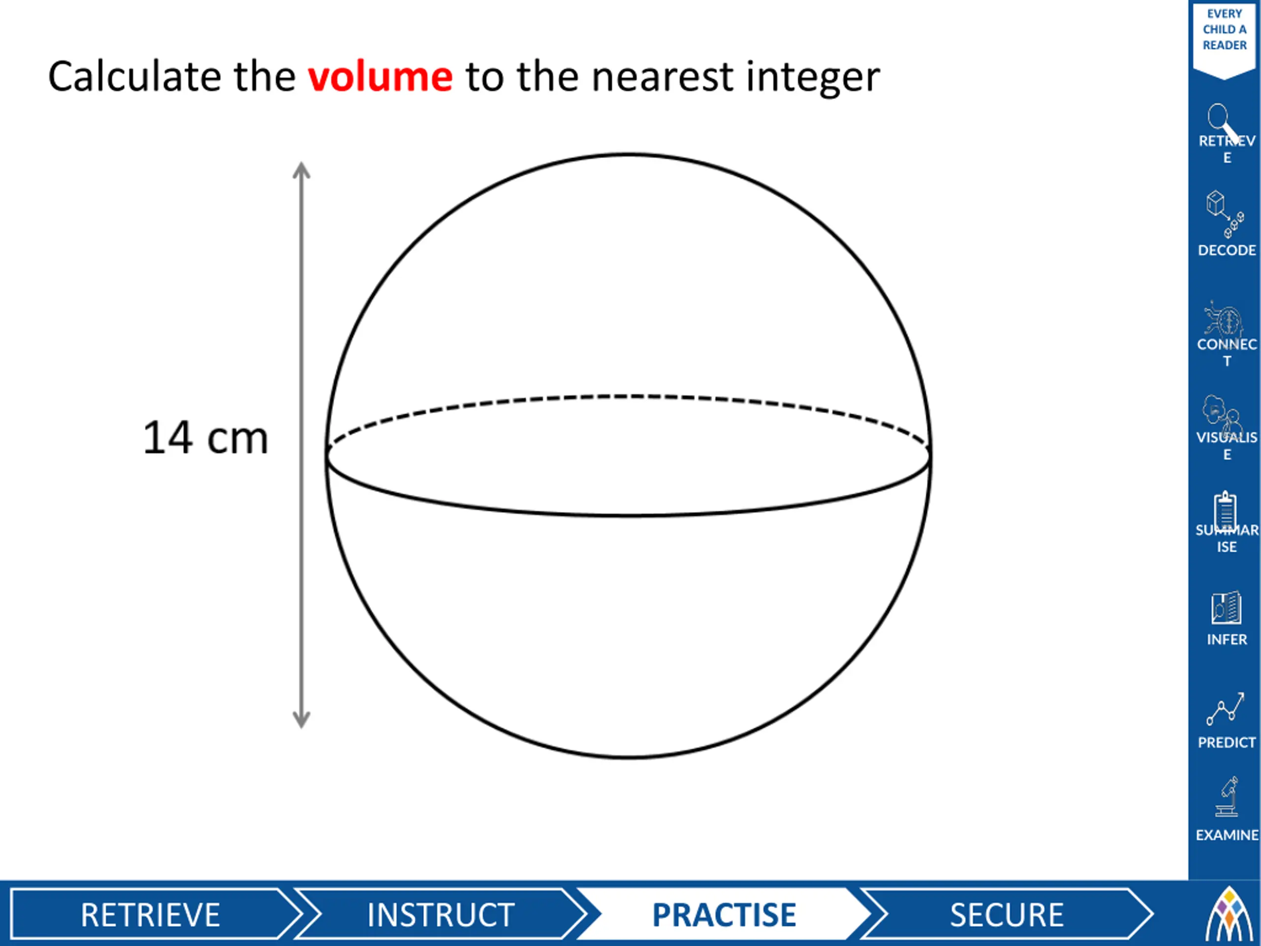 EVERY CHILD A READER Calculate the volume to the nearest integer RETRIEV E DECODE CONNEC T VISUALIS E SUMMAR ISE INFER PREDICT EXAMINE RETRIEVE INSTRUCT PRACTISE SECURE