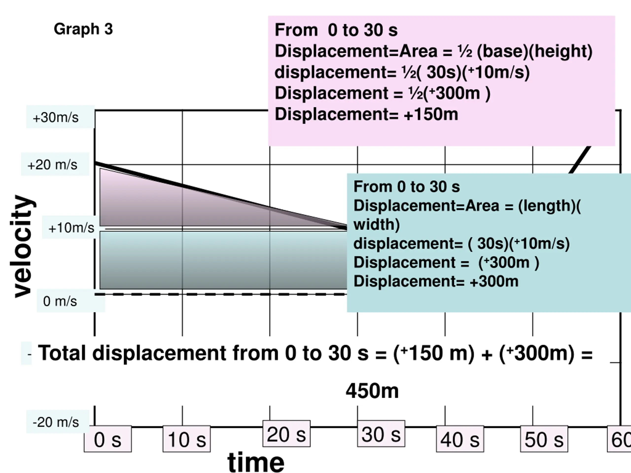 From 0 to 30 s Displacement=Area = (base)(height) displacement= ( 30s)(+10m/s) Displacement = (+300m ) Displacement= +150m Graph 3 +30m/s +20 m/s From 0 to 30 s Displacement=Area = (length)( width) displacement= ( 30s)(+10m/s) Displacement = (+300m ) Displacement= +300m velocity +10m/s 0 m/s -10 m/s Total displacement from 0 to 30 s = (+150 m) + (+300m) = 450m -20 m/s 20 s 30 s 0 s 10 s 40 s 50 s 60 s time