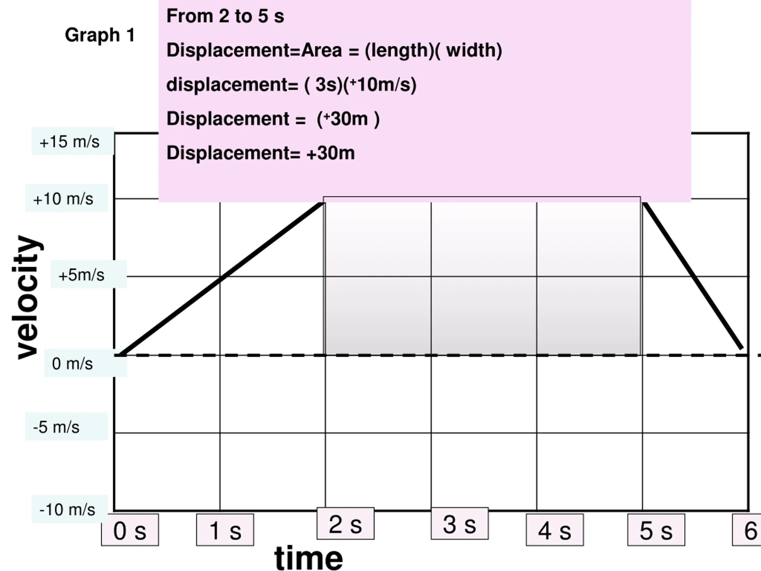From 2 to 5 s Graph 1 Displacement=Area = (length)( width) displacement= ( 3s)(+10m/s) Displacement = (+30m ) +15 m/s Displacement= +30m +10 m/s velocity +5m/s 0 m/s -5 m/s -10 m/s 2 s 3 s 0 s 1 s 4 s 5 s 6 s time