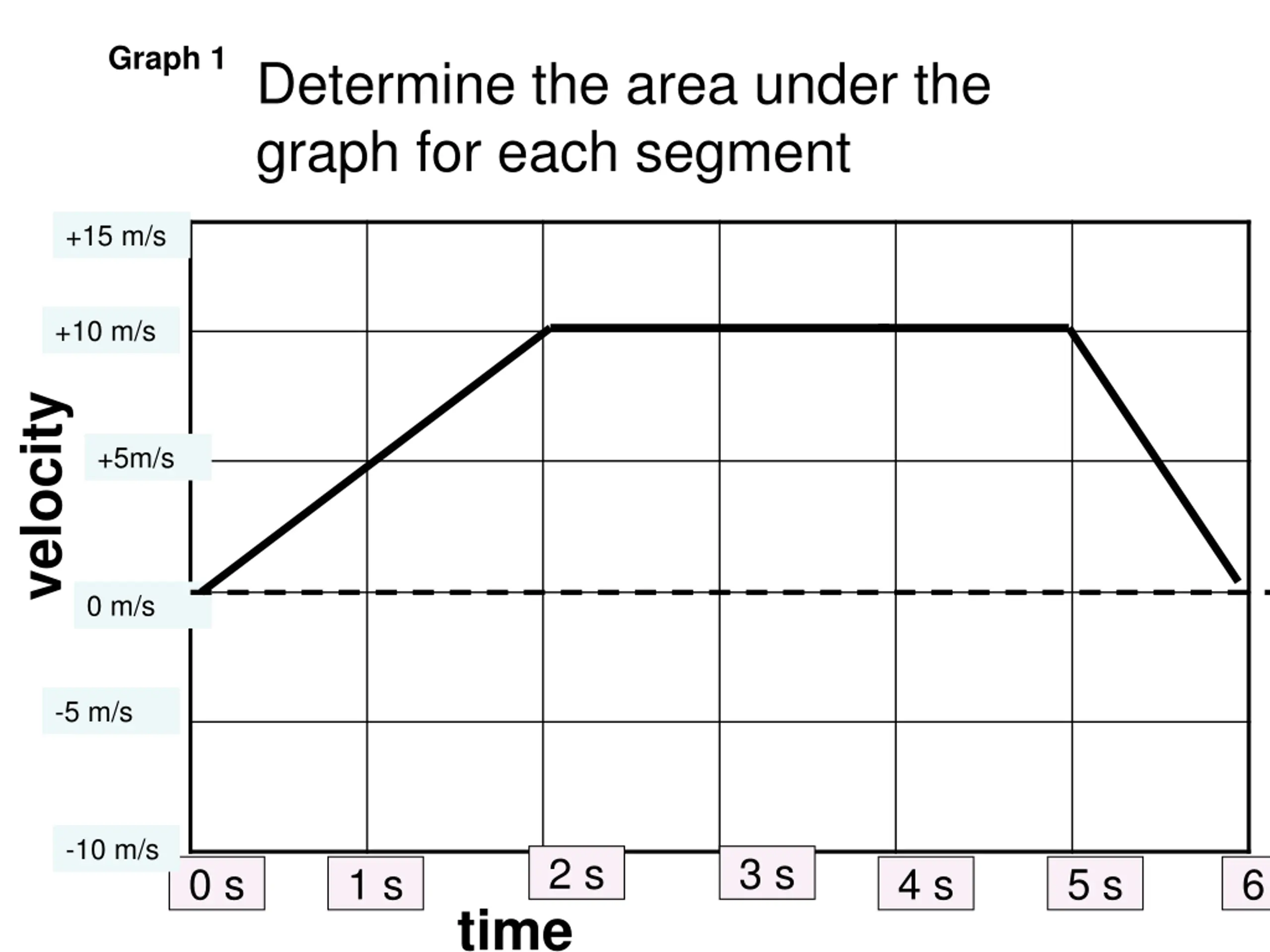 Graph 1Determine the area under the graph for each segment +15 m/s +10 m/s velocity +5m/s 0 m/s -5 m/s -10 m/s 2 s 3 s 0 s 1 s 4 s 5 s 6 s time